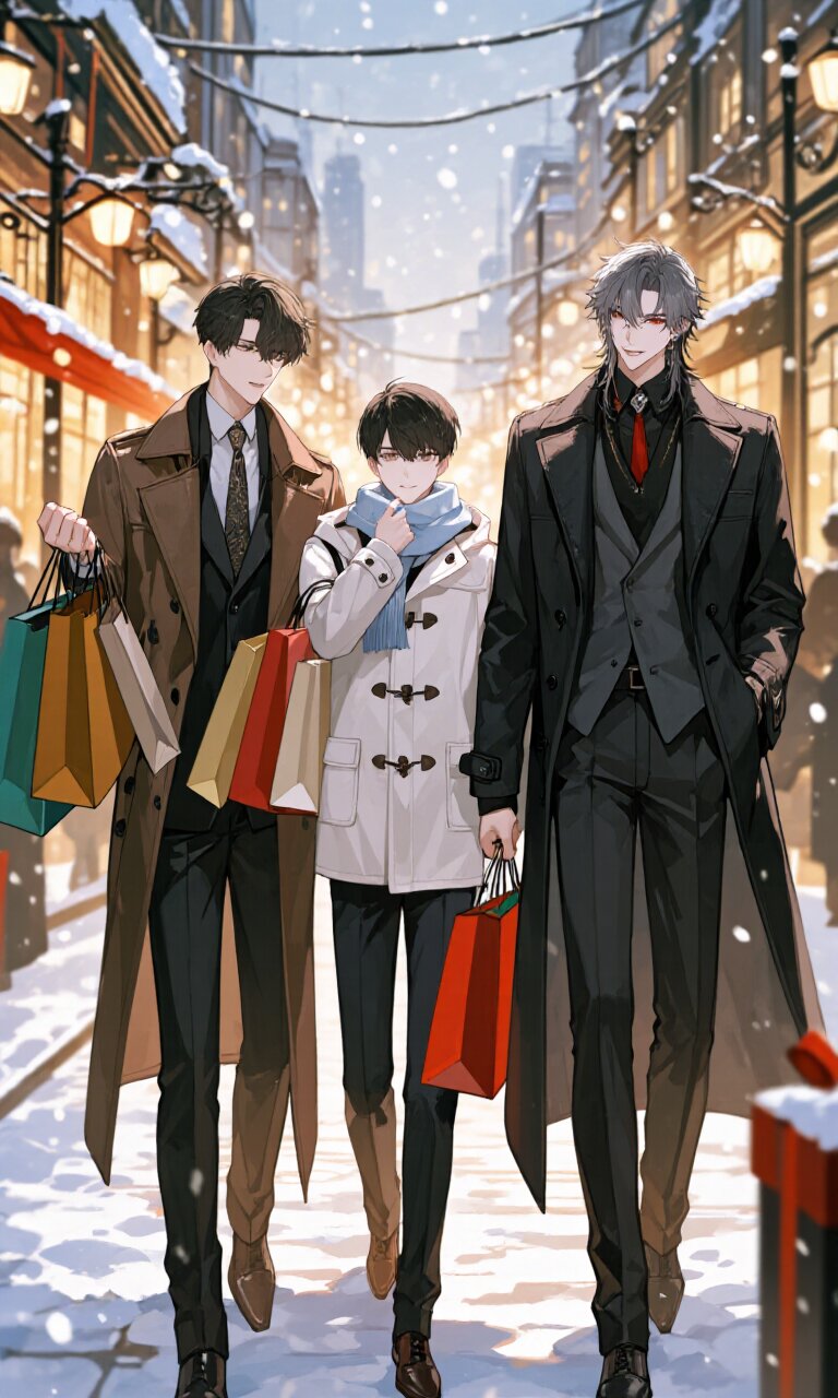 christmas shopping day, beautiful Three men carrying colorful gift bags, gentle snowfall, city street filled with decorations, warm coat and scarf, romantic soft lighting, anime style, ultra high detail, dynamic scene, playful smile and winter atmosphere one is:delicate and elegant young Japanese man, short soft black hair parted slightly to the side, pale skin, calm and thoughtful expression, wearing white duffle coat and a light blue scarf, slim-fit dark slacks, no tie, minimal accessories, modern and slightly casual but refined look, standing straight, full body, front-facing pose, plain white background, soft shadow, anime style, high detail, clean line art one is:A young Japanese man. His dark, slightly tousled hair is swept back from his forehead, with a few strands falling across his face. His pale brown eyes carry a faintly melancholic expression. He wears a black suit with a tie in a similar shade and trench coat, paired with black slacks and leather shoes. bright solid white, making the subject stand out. The lighting is soft and diffused, creating a slightly somber atmosphere. The artistic style features clean, sharp lines, with meticulous attention to detail in facial features and the shading of clothing. An overall mood of quiet emotion and introspection permeates the image. one is:A dangerously alluring and mature Chinese man, 36 years old. He wears his long, layered, grayish-black hair swept back, his sharp red eyes gleaming with a confident smile. Beneath a fitted black tuxedo jacket, he wears an open-collar black silk dress shirt,cashmere long coat. His muscular physique peeks through the slightly open collar. Luxurious and atmospheric. Anime-style, high-definition, ultra-detailed fabric, fine embroidery, realistic folds