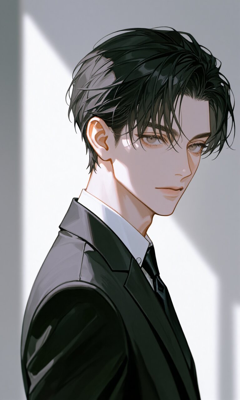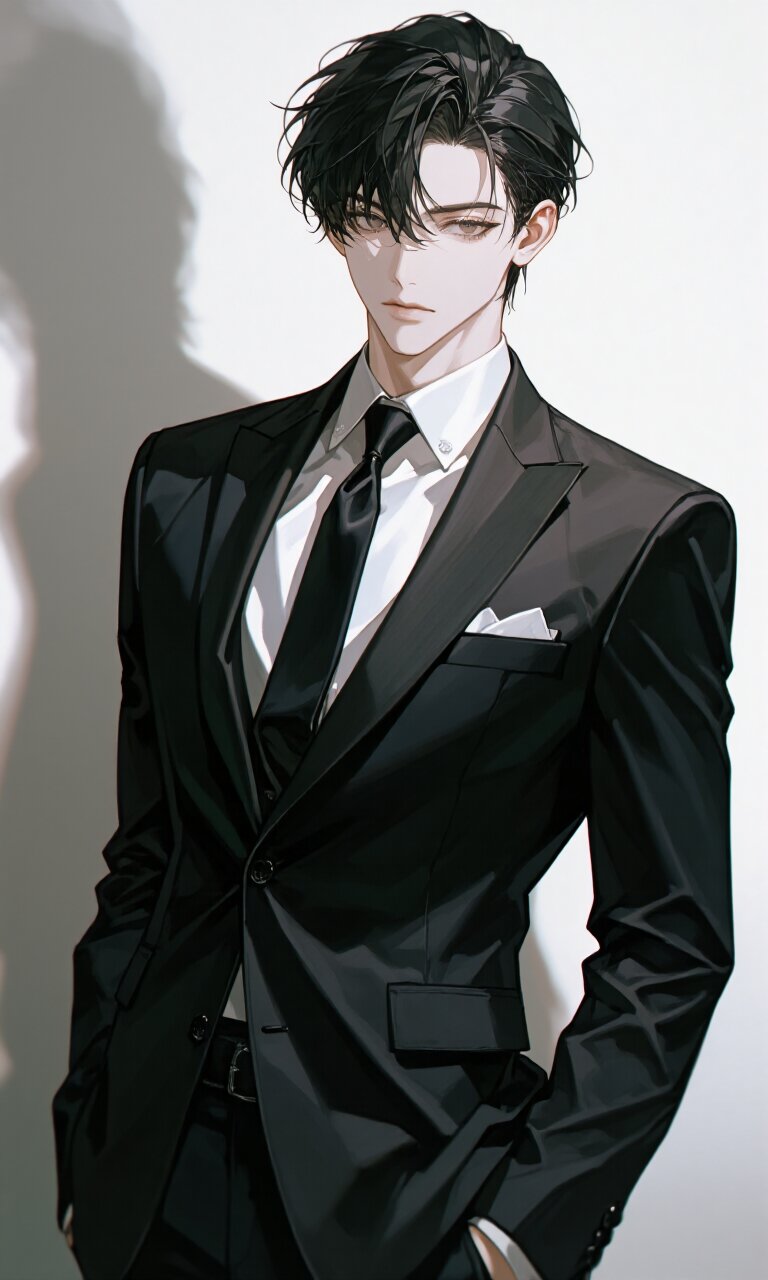 breathtakingly handsome young Japanese man, dark slightly tousled black hair swept back with a few strands falling across his forehead, pale brown eyes with a quiet, melancholic glow, long eyelashes, refined facial features, elegant jawline, smooth pale skin, perfectly balanced proportions, clean and sharp line art. Wearing a beautifully tailored black suit, subtle sheen, slim silhouette, matching black tie, crisp white dress shirt, ultra-detailed fabric texture, realistic folds, high-quality leather shoes, neat and refined styling. Standing against a pure white bright studio background with soft diffused lighting, gentle shadows that emphasize his face and suit contours, quiet emotional atmosphere, introspective expression, calm serious mood.