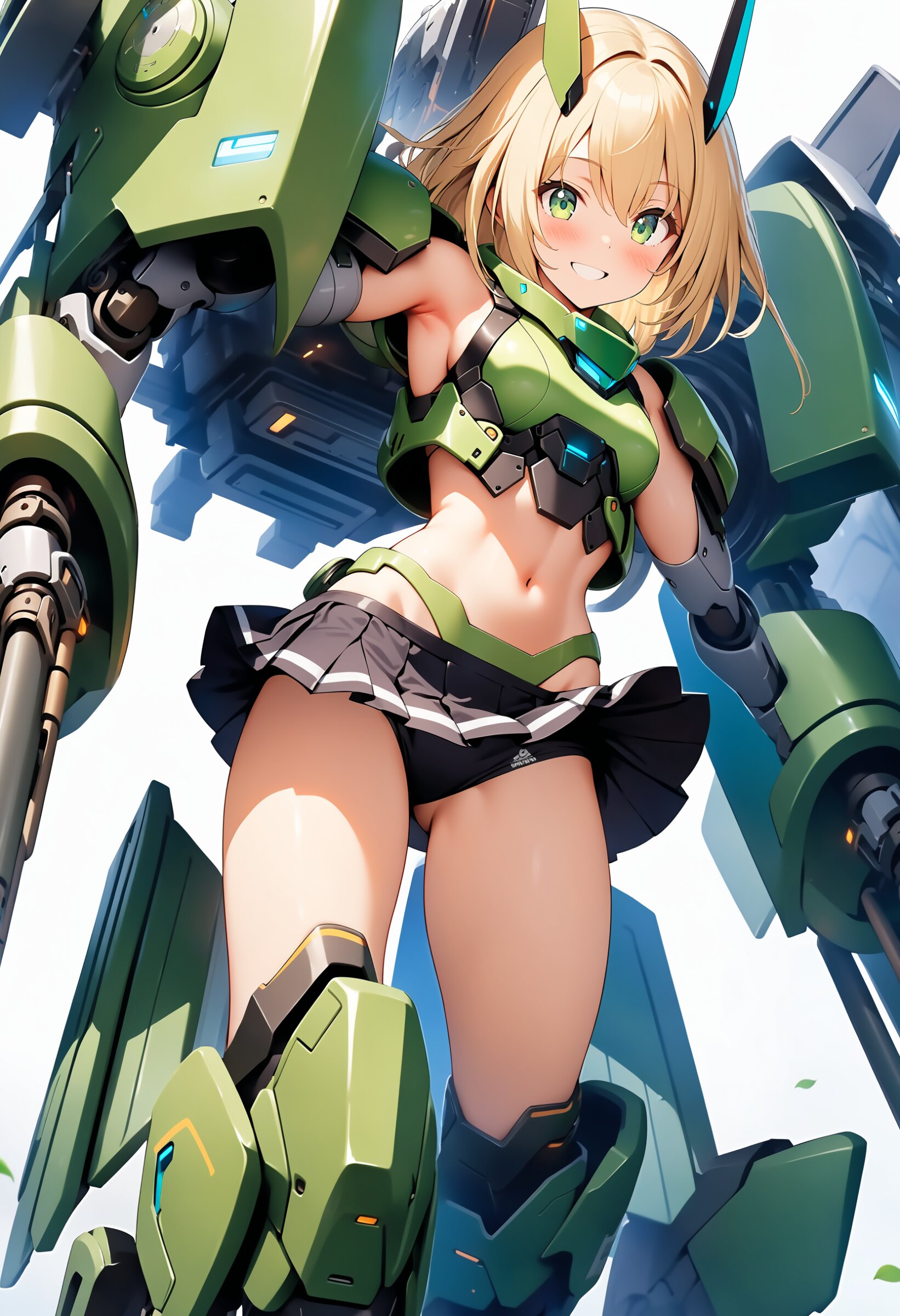 1girl, ((white background)), ultra detailed 8k cg render, masterpiece, high resolution, extremely detailed, mecha musume,mecha shoulder, mech leg, headgear, mecha armor, ((mini skirt)),long blonde hair, dropping green eyes, smile, dynamic posing,