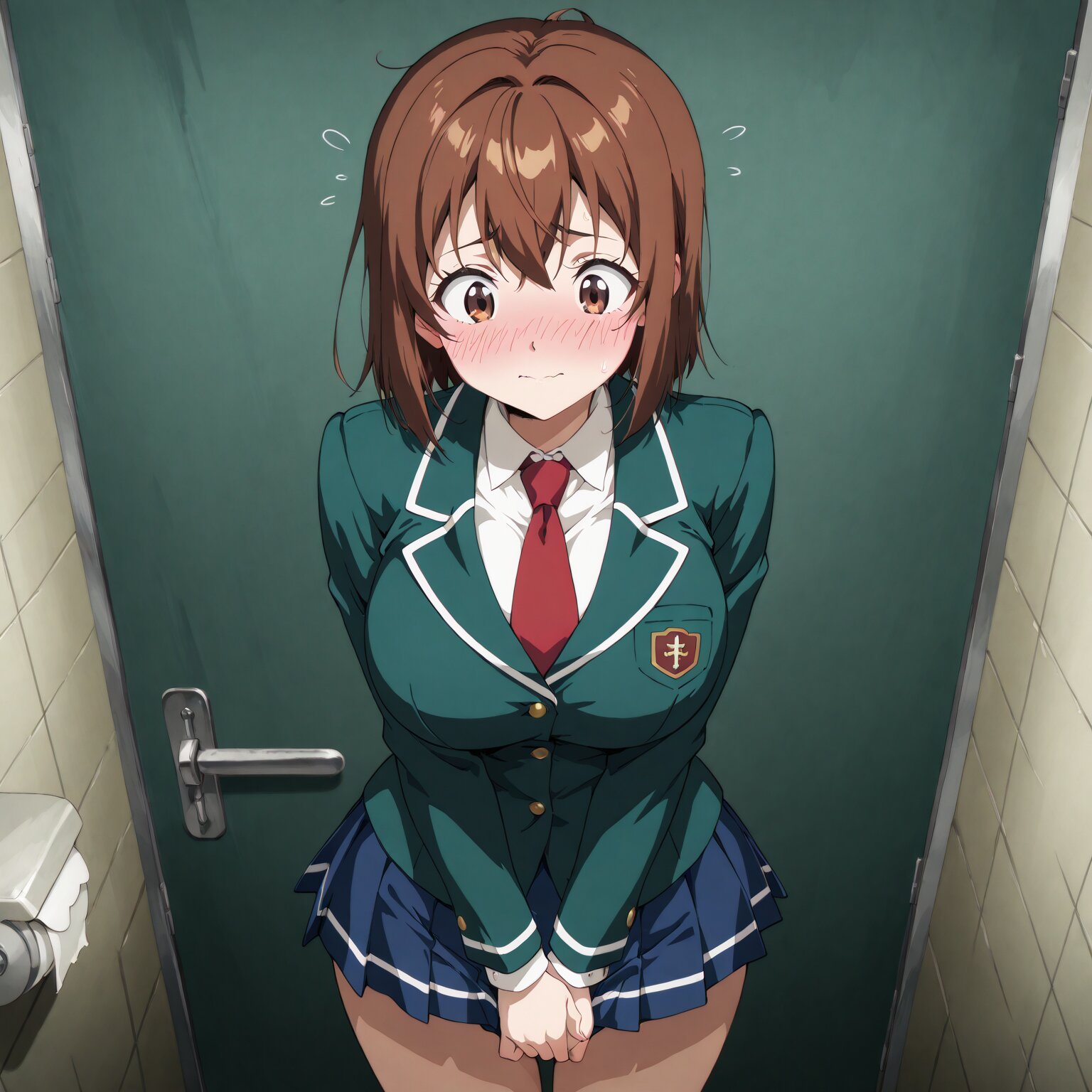 (1girl) Short hair, brown hair, straight hair, russet eyes, gentle face, large breasts (tareme:0.8) School uniform, green blazer, dress shirt, tie Pleated skirts, mini skirts, Blushing, embarrassed, fidgeting, hands on crotch Women's restroom, stall BREAK, ((newest, anime, animation, anime screen capture, anime style:1.3)) BREAK, ((masterpiece, , vibrant, very aesthetic, highly detailed, best quality, 16k:1.3)) perfect fingers,