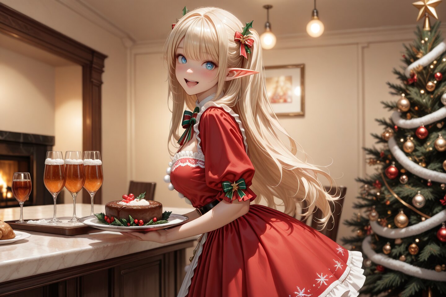(A bar decorated for Christmas), decorated Christmas tree. she wears red colored frilled dress style Santa-Claus-costume, (She carrying a Christmas dinner on plate and drink on tray). cowboy shot, from side, open mouth happy smile, gaze at viewer, heart effect around her, Intricate embroidery and decoration, ultra detailed lips, ultra detailed face and hair, ultra detaild eyes, beautiful eyes, A kawaii, adorable, cute, elf girl, (apatite eyes with CGI Effect), (deep blonde hair:1.2), indoors, break. Christmas foods on table,, masterpiece, amazing quality, very aesthetic, high resolution, ultra-detailed, absolute, newest, 2d, semi-realistic, moe heroine, sharp focus,, <lora:elf-san_alpha1(AnimagineV31):0.7> <lora:elf-san_alpha4(IL1.0):0.7>, anime style, anime color,