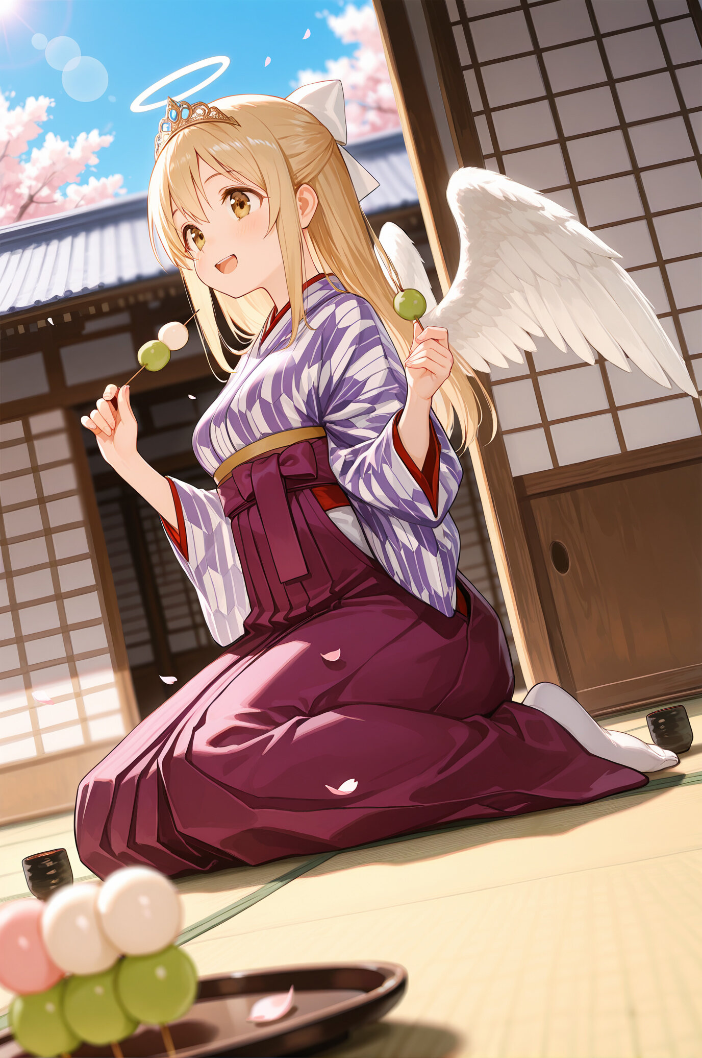 masterpiece, best quality, absurdres, 8k, ultra detailed, aesthetic, very aesthetic, newest, <lora:Fixhands_anime_bdsqlsz_V1:0.5>, <lora:bold-16oa:-0.5>, (realistic:0.3),BREAK (shallow depth of field,Gaussian Blur:1.6),(outdoors,blue sky,lens flare:1.3), cute young girl in Taisho-era haikara fashion,meiji schoolgirl uniform,yagasuri,purple,sitting on engawa,wariza,holding a skewer of three-color dango (pink, white, green),bringing the dango to her mouth, soft delighted expression,natural eating pose, warm wooden textures, sliding shoji doors, bamboo blinds,tatami interior visible behind her,small ceramic tea cup beside her, serving tray on the engawa,full-bloom cherry blossoms surrounding the tea house,petals gently falling around her,soft warm lighting, nostalgic atmosphere,(happy:1.3),(smile,tareme:1.3),blonde hair, long hair, brown eyes, (white angel wings:1.2),tiara,(standing,side view:1.3),,open mouth,(fullbody shot,wide angle,wide shot:1.3),(medium breasts,curvy:1.3),<lora:USNR STYLE_XL_loha:0.8>