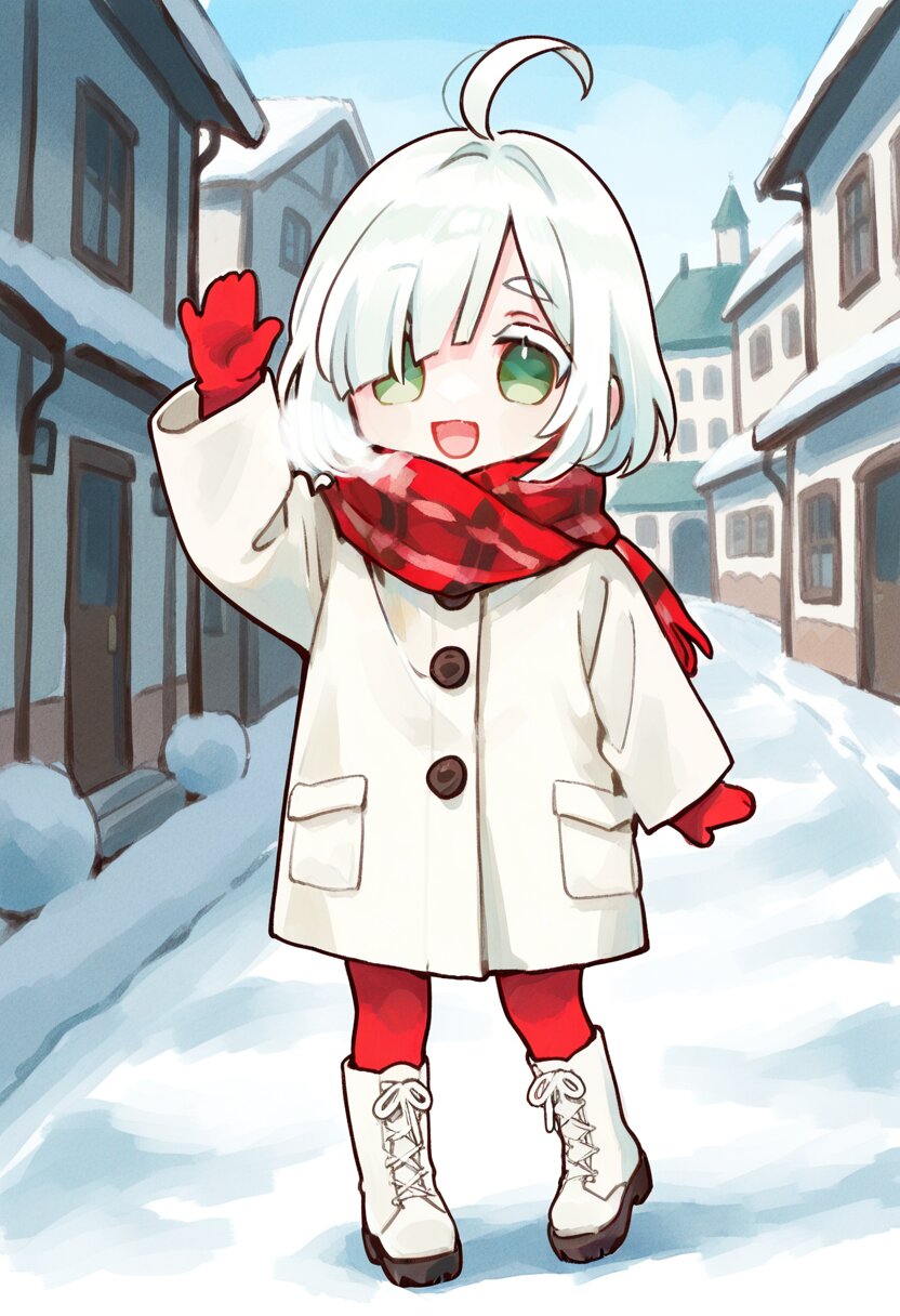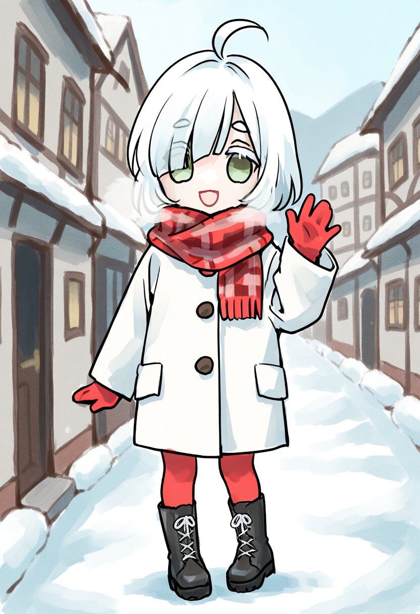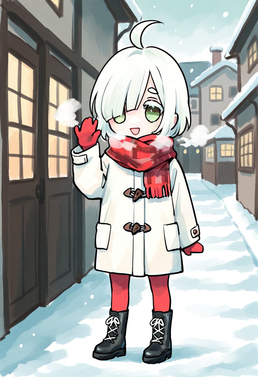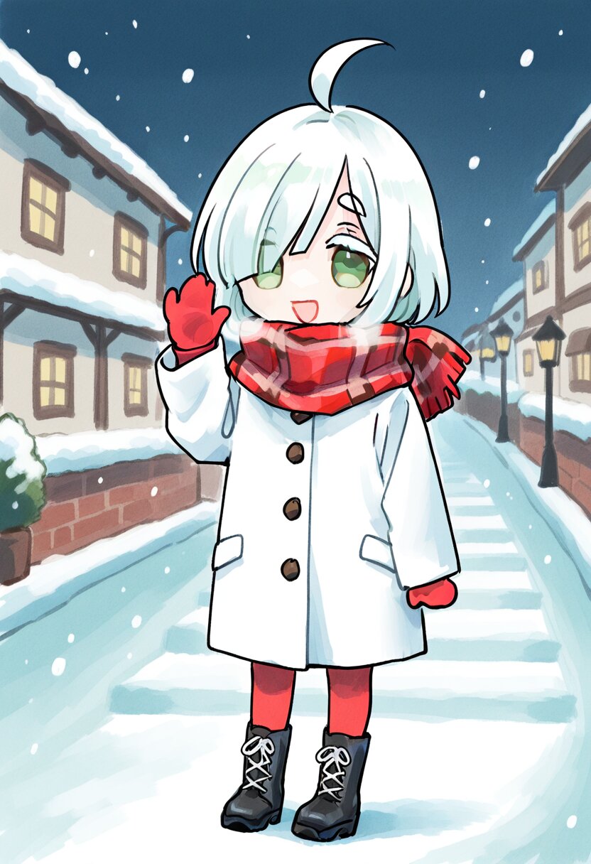 <lora:inmnstyleilxl:0.9>, best quality, masterpiece, very aesthetic, watercolor painting, general, 1girl, chibi, solo, (bright white hair), short hair, blunt bangs, white thick eyebrow, white colored eyelashes, (hair over one eye), ahoge, mint green eyes, oversize white coat, red plaid scarf, red mitten, red tights, white lace-up boots, town, snow, white breath, smile, open mouth, waving