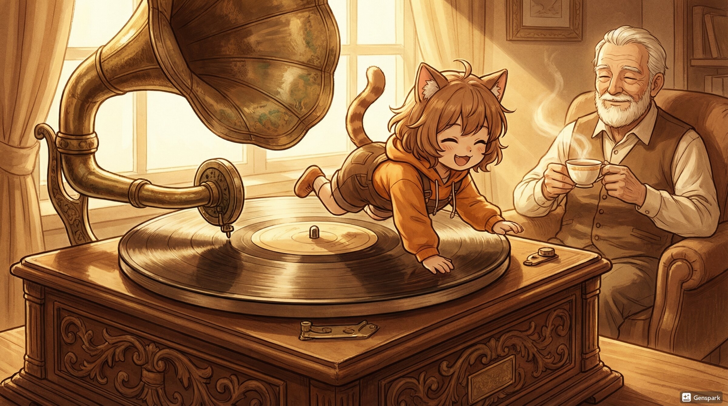 An illustration featuring a cat-eared character joyfully running on all fours across a giant, antique record player. The character wears playful, movement-friendly clothing to match the lively scene. Nearby, a serene elder man enjoys the music with a gentle smile, enhancing the nostalgic warmth. The record player is intricately designed, reflecting its vintage charm. Use warm color tones to evoke a feeling of joy and nostalgia, with skillful light and shadow effects to add depth and expression.