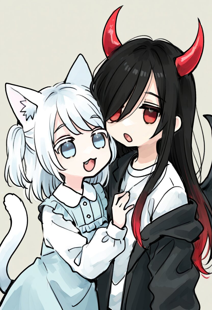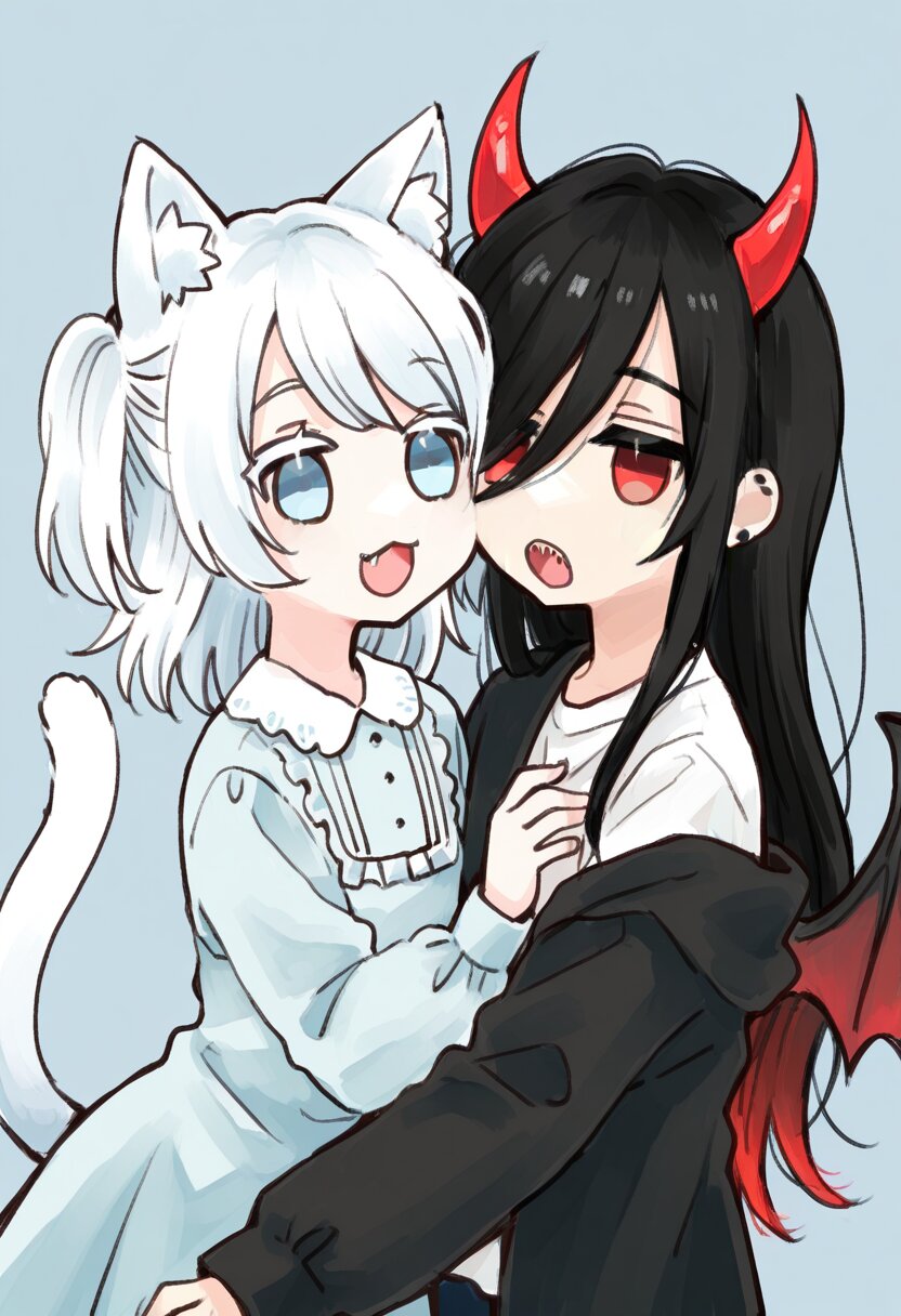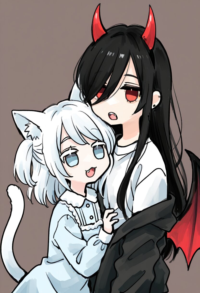 <lora:inmnstyleilxl:0.9>, best quality, masterpiece, very aesthetic, watercolor painting, general, 2girls, chibi, BREAK 2girls, white hair, two side up, medium hair, braid bangs, swept bangs, pale blue eyes, white colored eyelashes, :3, fang, smile, open mouthwhite frilly longsleeves dress, cat ears, cat tail, upper body, BREAK black hair, long hair, wavy hair, long bangs, red colored tips, red eyes, jitome, black jacket, offshoulder jacket, white t-shirt, open mouth, sharp teeth, devil horns, devil wings, upper body
