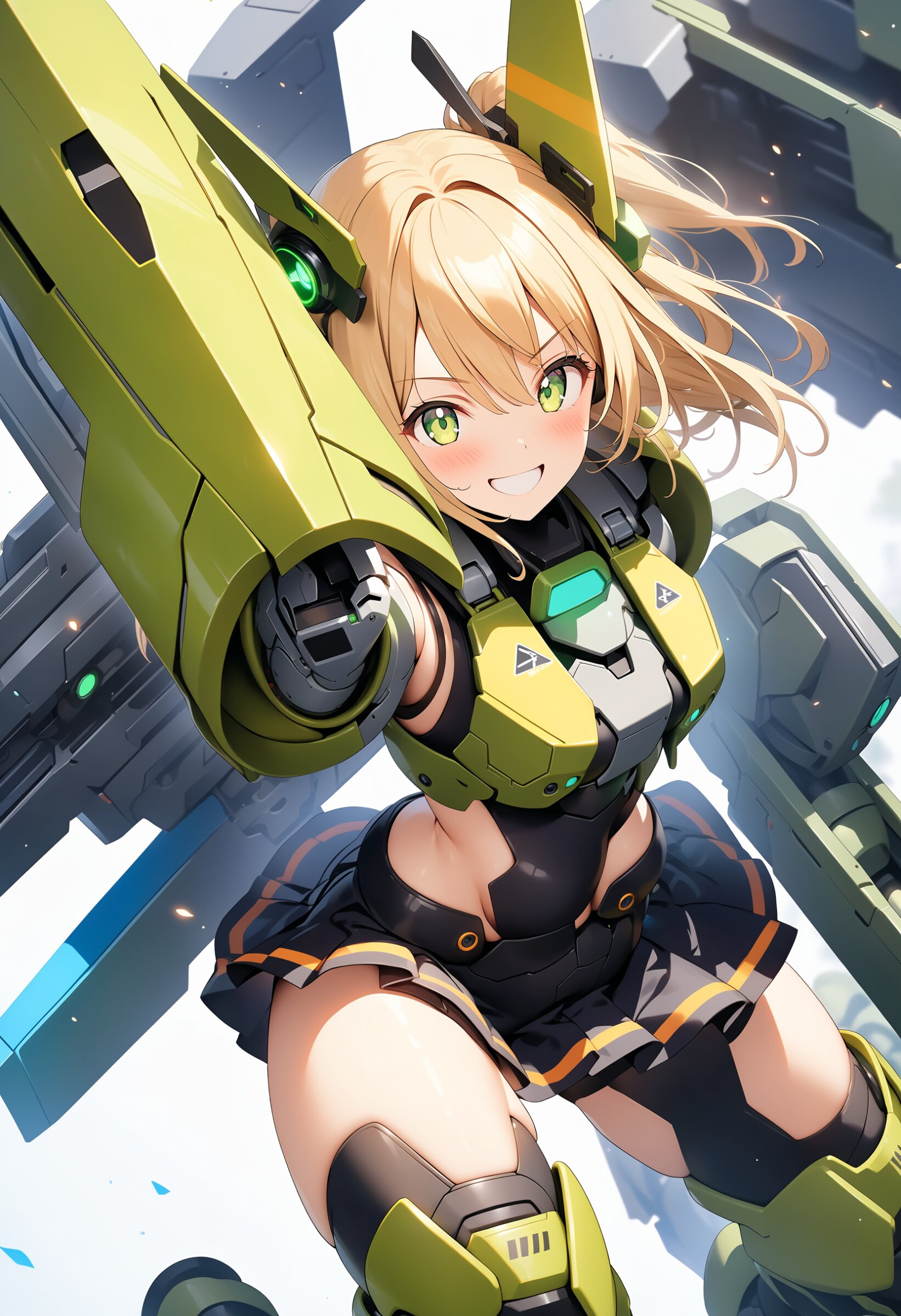 1girl, ((white background)), ultra detailed 8k cg render, masterpiece, high resolution, extremely detailed, mecha musume,mecha shoulder, mech leg, headgear, mecha armor, ((mini skirt)),long blonde hair, dropping green eyes, smile, dynamic posing,