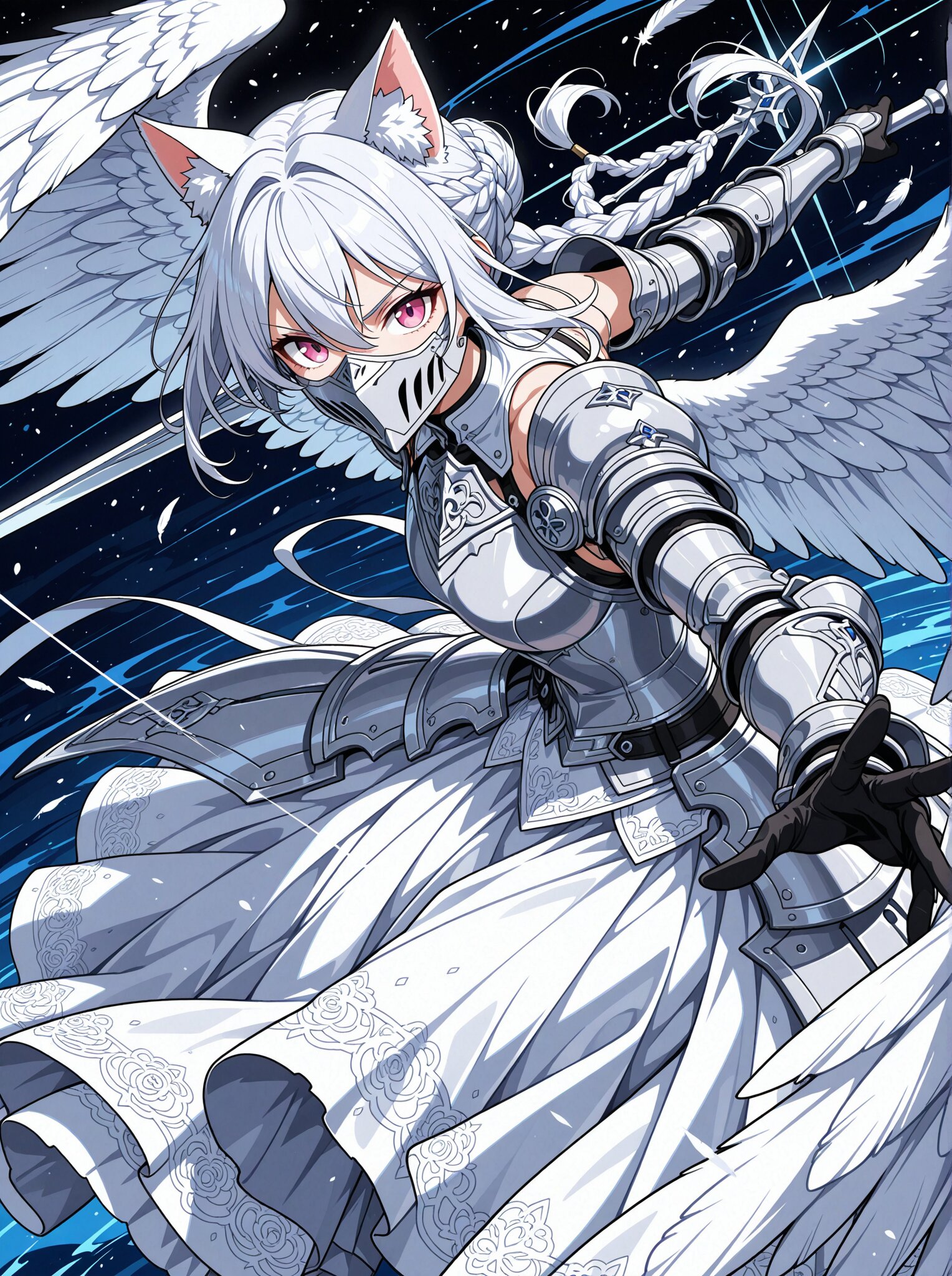 1girl, cat ears, silver-white hair, intricate braid hairstyle, loose strands, loose updo hairstyle, pink eyes, hair between eyes, angel wings, v-shaped eyebrows, princess outfit, long skirt, light silver armor elements, ornate chestplate with floral engravings, delicate shoulder guards, integrated flowing skirt armor, refined noble aesthetic, slender silhouette, metallic mouth guard, armored face mask, matching silver and white design, detailed metal and fabric textures, soft lighting, high-quality fantasy illustration, dynamic pose, dynamic angle, holding weapon, looking at viewer, strong foreshortening, dynamic perspective, dramatic angle, (masterpiece, best quality, ultra-detailed, intricate details, anime style, 8k illustration, vector art, depth of field),