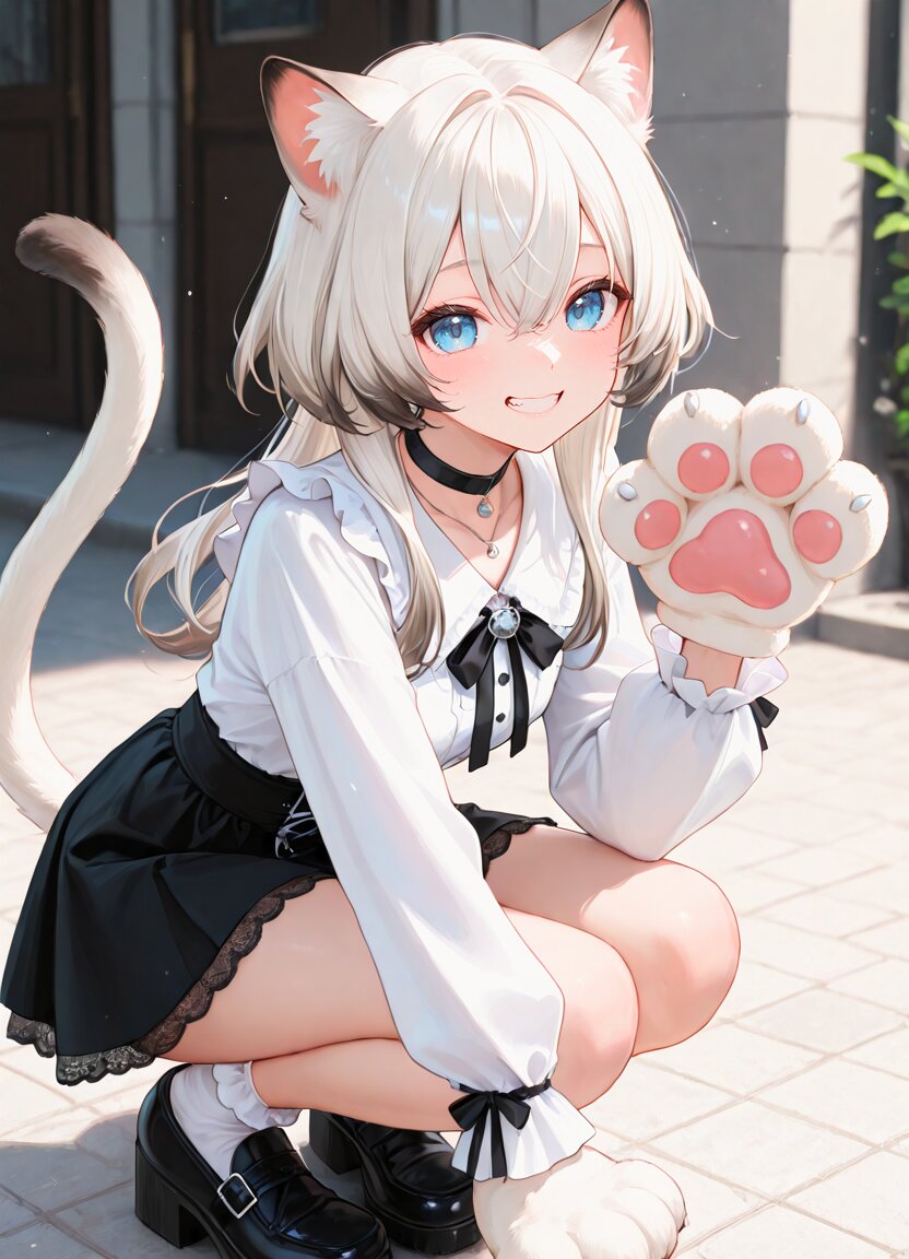 general, 1girl,solo,10yo,siamese cat girl,cat ear,cat tail,white hair, long hair,wispy bangs,hair between eyes,<lora:kuragecut_v1_illustrious_xl:1>,kuragecut, blue eyes,tareme,small breasts, jirai kei,necklace,black choker,white shirt,jewelry, black skirt,black shoes,white frilled socks, grin,paw pose,paw gloves,squatting,, appropriate posture,appropriate configuration,ideal ratio body proportions,perfect anatomy, <lora:Fixhands_anime_bdsqlsz_V1:1>, masterpiece,best quality,newest,absurdres,highres,ultra high res,8K UHD,hyper-detailed,
