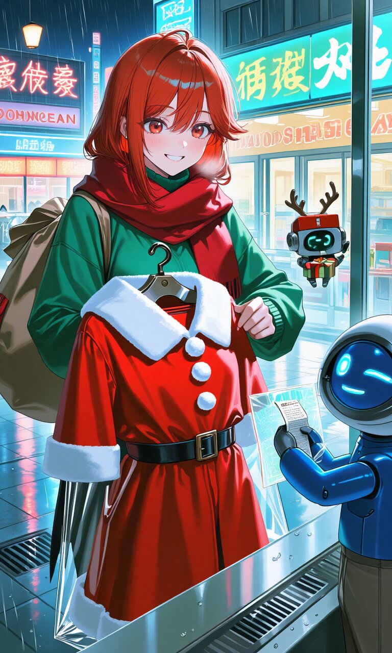 A cheerful young woman with vibrant red hair stands at the counter of "DROHNCLEAN," a futuristic dry cleaning shop in a neon-lit city. She wears a cozy green turtleneck sweater and a stylish red scarf, with a large canvas sack slung over her shoulder. A friendly blue robot attendant hands her a glowing holographic receipt as she picks up her freshly cleaned Santa Claus outfit, which is neatly enclosed in a transparent garment bag—its bright red fabric and white fur trim shining vividly. The background is alive with glowing neon signs, holographic advertisements, and the ambient buzz of the city. A small helper robot scurries by, carrying a wrapped present, adding to the festive yet high-tech atmosphere. The scene captures a perfect blend of holiday warmth and cyberpunk aesthetics, with crisp details and vibrant colors enhancing the pop-inspired futuristic vibe.