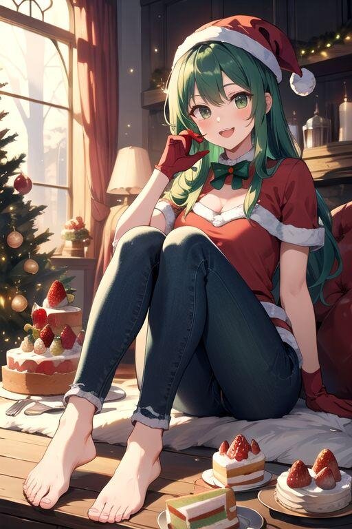 普段からサンタコスの素足緑髪さん、クリスマスケーキも手慣れたものですね!