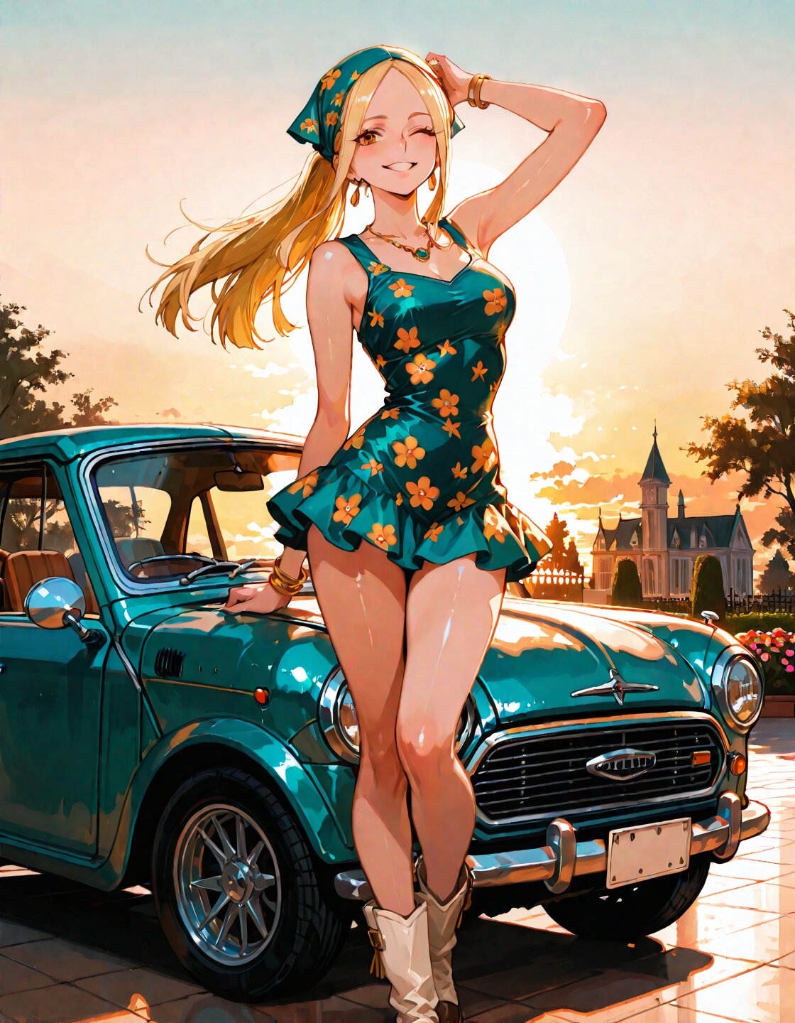 solo,1girl, long hair,straight hair,blonde,forehead,center parted bangs,blonde hair,amber eyes, delicate face, detailed face, detailed skin, fair skin,masterpiece, best quality, insanely detailed, highly detailed, intricate, detailed eyes, beautiful eyes, beautiful face, beautiful hair, beautiful, 16k,cheerful grin,ponytail,shiny hair,head bandana,earrings,necklace,bracelets,retro designed one piece dress with flower pattern,mini skirt,white long boots,deck shoes,standing front of car,looking at viewer,one eye closed,open mouth,one arm up,outside,retrowave,chill atmosphere,classic academia,cowboy shot,golden hour,cinematic lighting,black mini cooper,garden,sunset,full body shot,retro pop style,nostalgic vibe,Vintage clothing from the 50s,with a mansion,windy