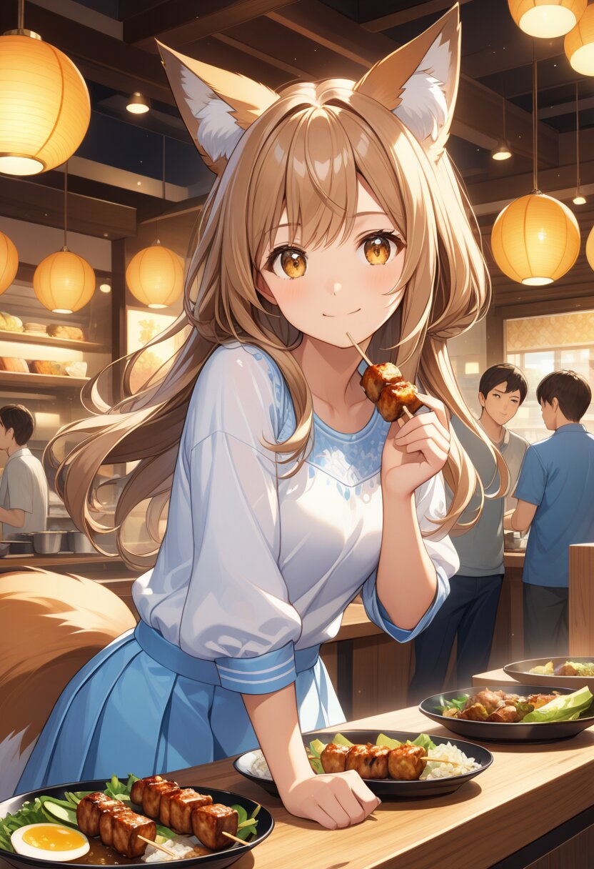 (high resolusion,illustration,ultra detailed 8k art,extremely detailed CG,official art,clothes reflecting light,detailed shiny skin,detailed background:1.3), ((highly detailed beautiful face and eyes),anime_style, fox_girl, fox_ears, light_brown_hair, double_eyelids, long_eyelashes, fluffy_tail, mini_skirt, tights, food_court, eating_yakitori, casual_pose, cheerful_expression, warm_color_palette, soft_lighting, lively_atmosphere, detailed_background, expressive_eyes, delicate_features, everyday_scene