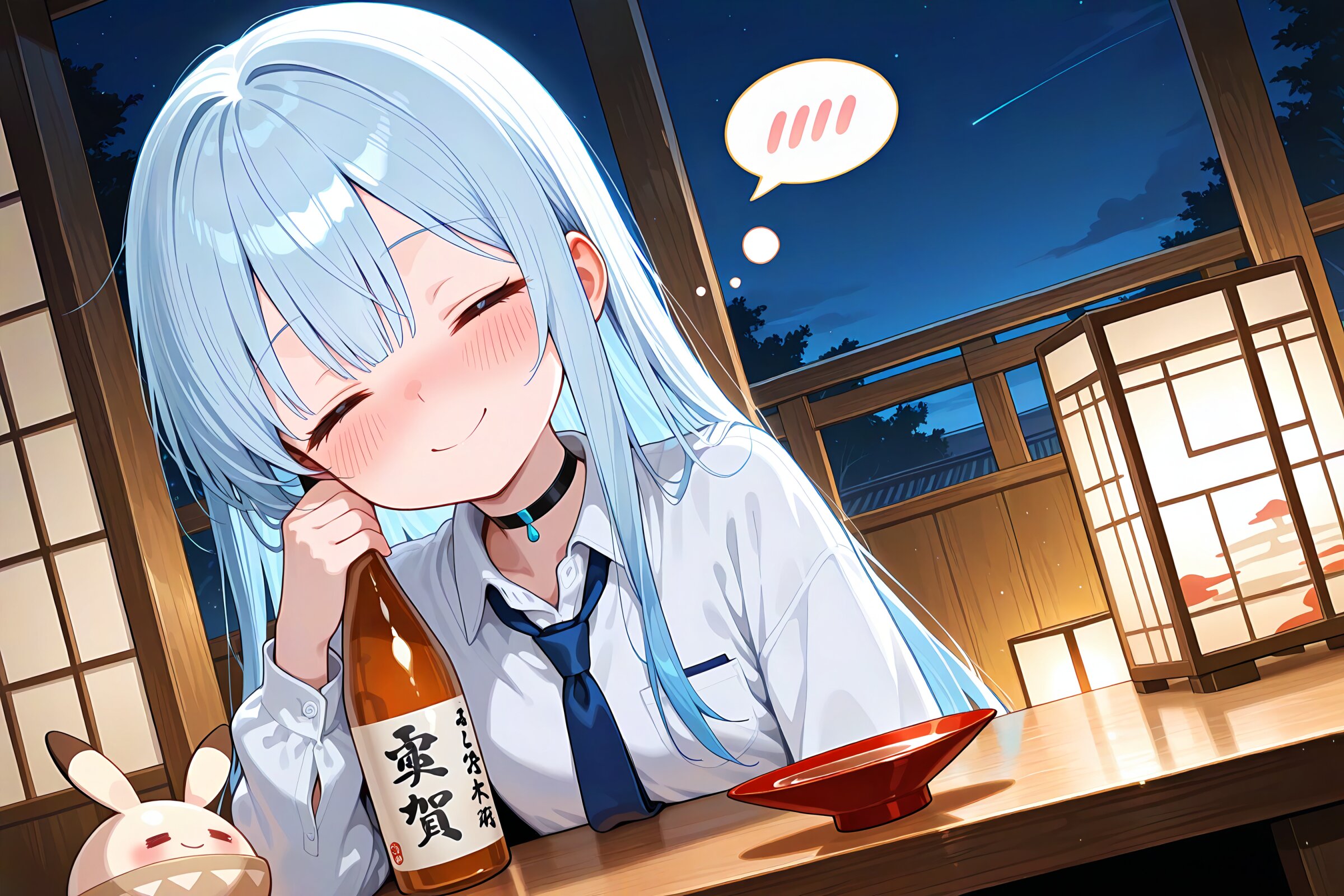 1 little girl, solo, upper body, diagonal angle, masterpiece, best quality, amazing quality, very aesthetic, sky blue hair, long hair, straight hair, =_=, smile, blush, squeans, spoken blush, choker, white business shirt, closed neck, blue tie, drink the sake, sake bottle on the table, humpty dumpty, in japanese restaurant, night,