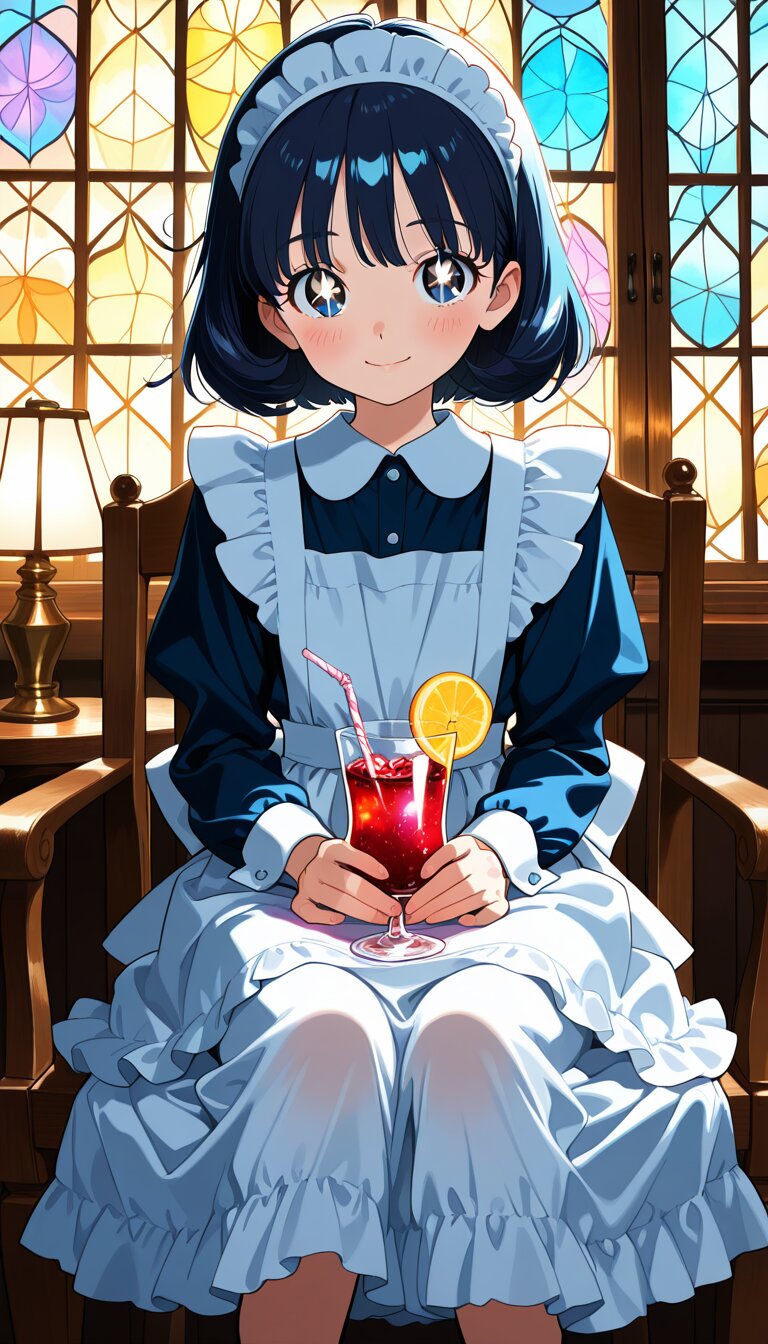 1girl, sitting on a chair in a retro-modern kissaten,the entire shop filled with dark blue ambient lighting, blue-toned illumination,stained-glass lamp in blue, wooden table, vintage interior details,tall slim soda glass with translucent rainbow cube-shaped jelly,sparkling soda with strong carbonation, many bubbles, condensation on the glass, paper straw,nretro maid outfit, modest apron dress, simple frills, headband,she sits on the chair and drinks the soda deliciously, sipping through the straw with a happy expression,\nnatural seated pose