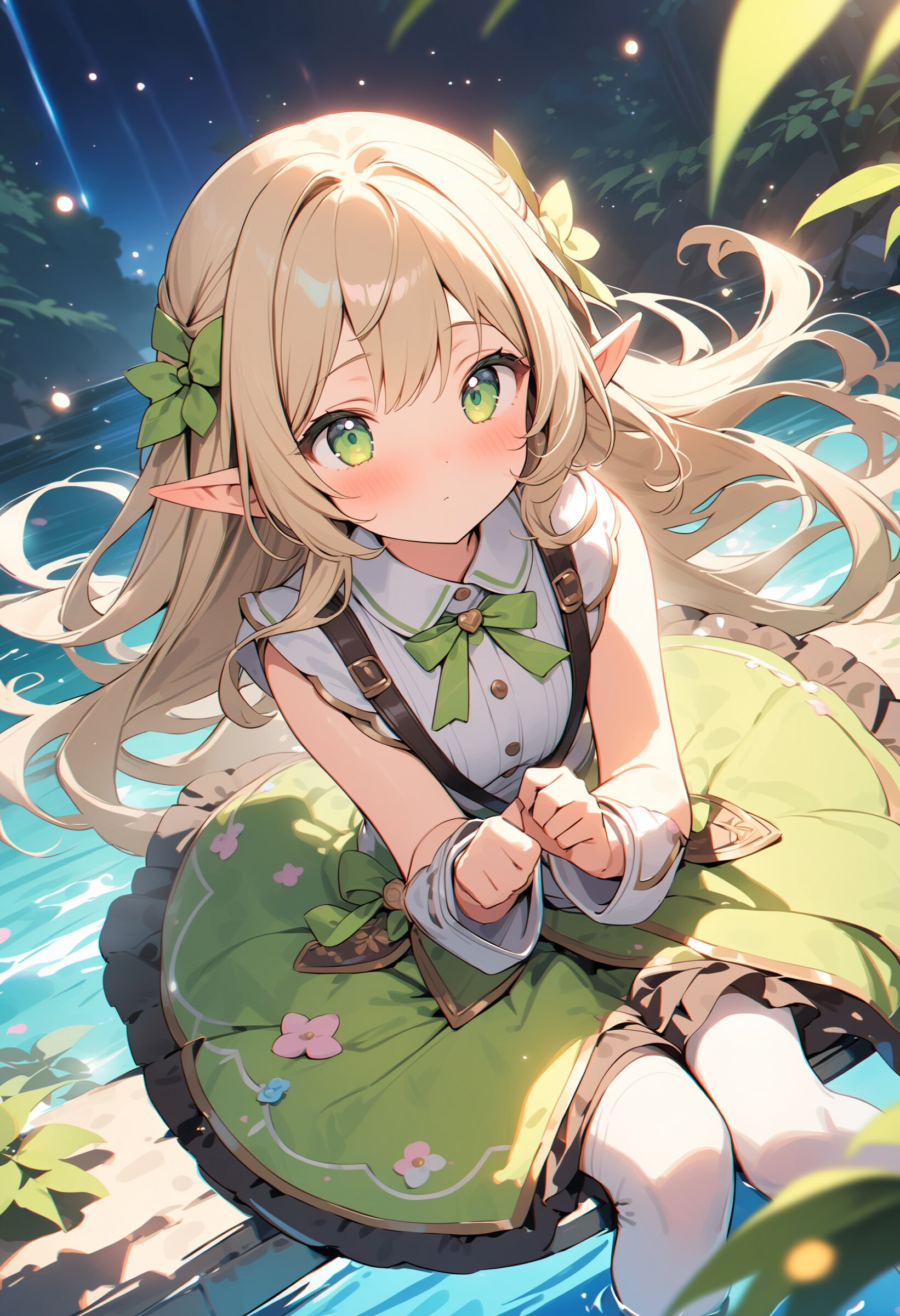 ((masterpiece)), ((best quality)), ((kawaii)), cute, (lovely), ((extremely detailed)), (beautiful), dynamic angle, a cute girl, 1girl, solo, ((elf )),beautiful blond hair, beautiful green eyes, ((beautiful eyes)), long hair, fantasy clothes,