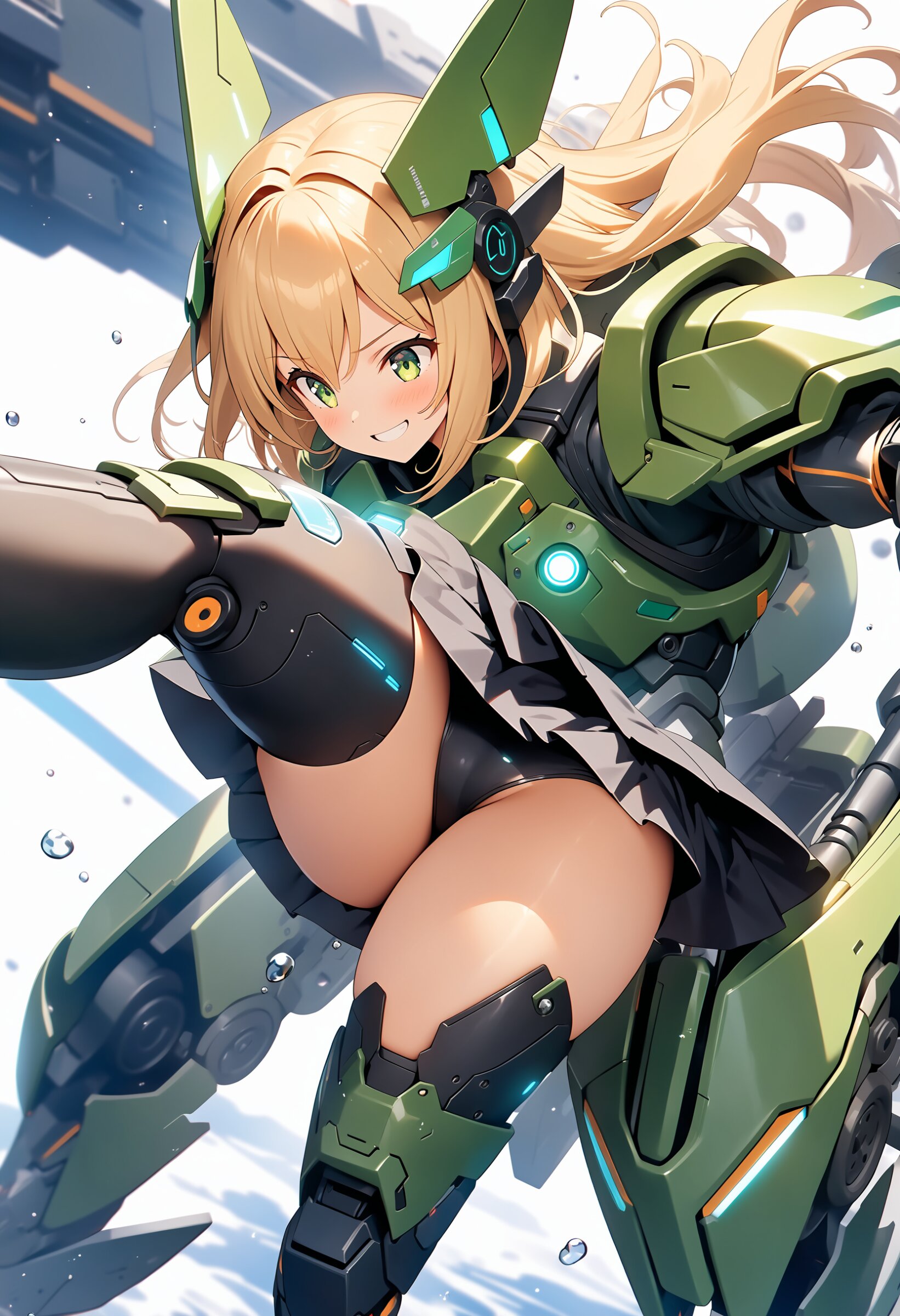 1girl, ((white background)), ultra detailed 8k cg render, masterpiece, high resolution, extremely detailed, mecha musume,mecha shoulder, mech leg, headgear, mecha armor, ((mini skirt)),long blonde hair, dropping green eyes, smile, dynamic posing,