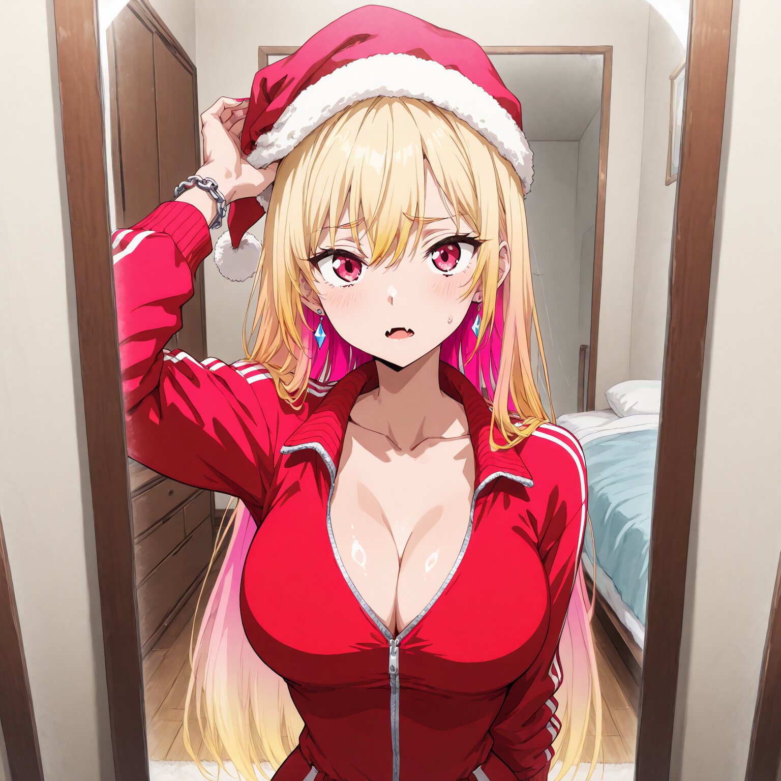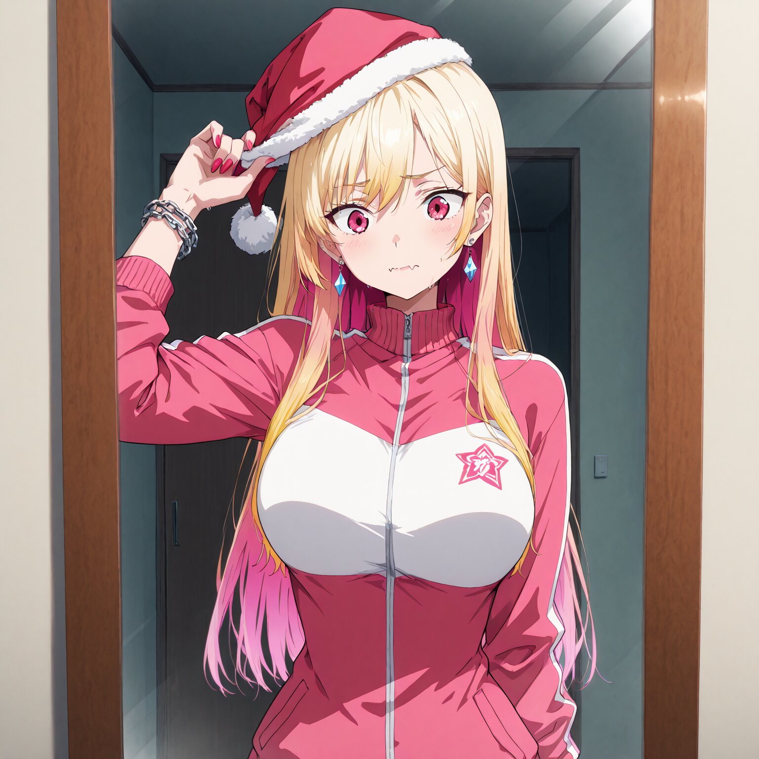 (1girl), solo, young female, BREAK, (((blond long hair, Straight Hair:1.7))), ((sharp bangs:1.5 )),((Long sideburns)),(((red eyes))), (slanted eyes), slender, (sweat:0.8), shiny body, shiny skin, (full breasts:1.3), Tight, tight waist, toned body, (muscular abs, abs:0.8), muscular BREAK, ((diamond-shaped earrings)), chain belts, chains, chain accessories, Chain bracelet, ring, (((pink inner hair, gradient hair from blond to pink:2))), ((skin fangs)), Long nails, red nail polish, gorgeous nail polish, pubic hair BREAK, Slender, narrow waist, toned body, athletic body, shiny skin, Highlights, beautiful eyes, beautiful pupils Tracksuit, loungewear Hand on hat, back view Inside the house, in one's own room, in one's own room (Looking in the mirror, wearing a Santa hat) Furrowed brow, troubled expression BREAK, ((newest, year 2024, anime, animation, anime screen capture, anime style:1.3)) BREAK, ((masterpiece, , vibrant, very aesthetic, highly detailed, best quality, 16k:1.3)) perfect fingers,