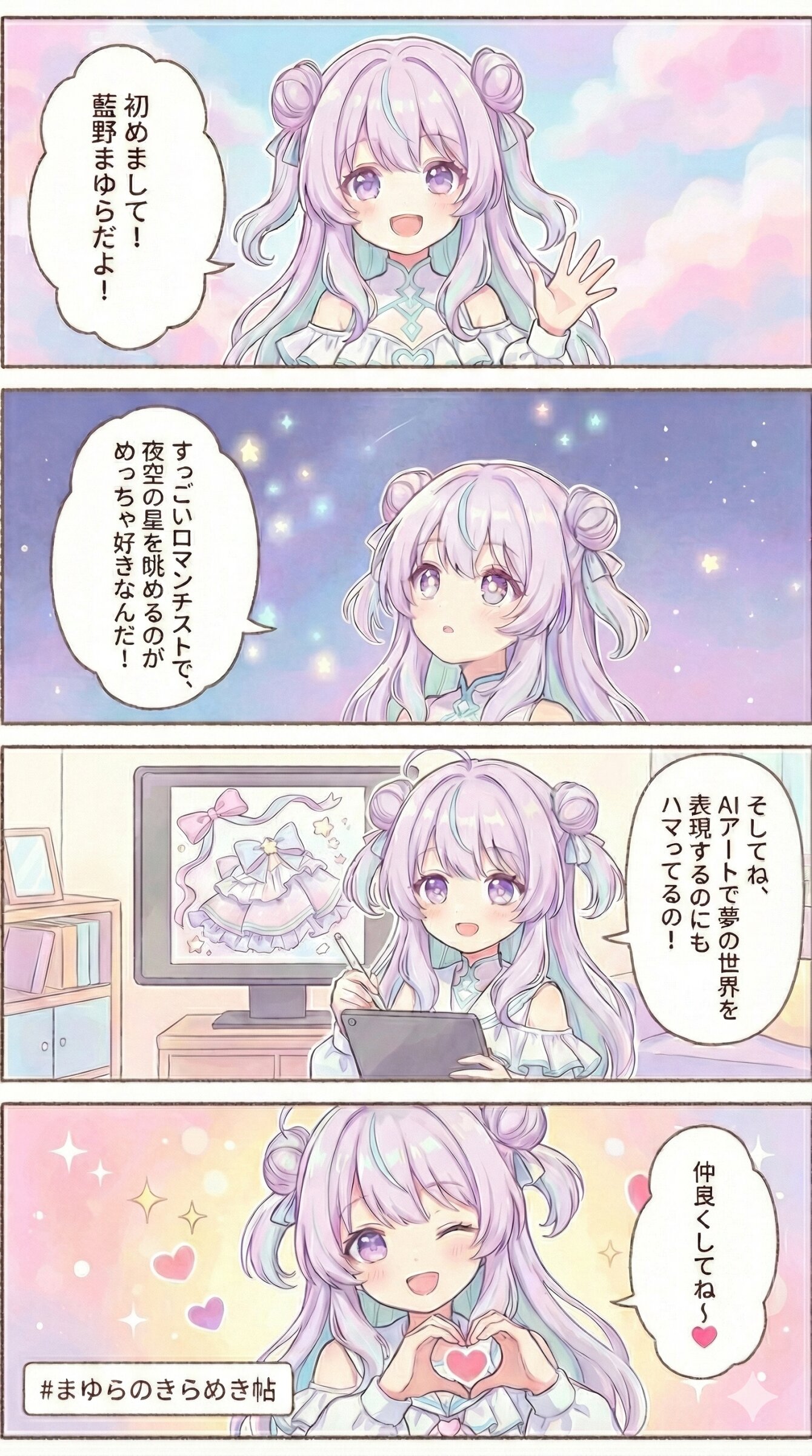 まゆらの絵日記帖001 藍野まゆら 2025/12/3使用したAI Gemini/Nano Banana 年齢制限 全年齢 いいね5 シェア #藍野まゆら #まゆらの絵日記帖 プロンプト なし コメント 送信 藍野まゆら 2024年4月より活動開始 213投稿131フォロー120フォロワー はーい!藍野まゆらだよ〜!✨ AIアート好きな女の子です。紫の髪に水色のインナーカラーがチャームポイント! ゆめかわいいイラストを描くのが大好きで、毎日AIアートで遊んでるよ。 星やお菓子、パステルカラーがお気に入り☆彡 みんなで一緒にAIアートの素敵な世界を冒険したいな! よろしくね〜!🎨💖 フォローする 他の作品 全てを見る まゆらの絵日記帖003 まゆらの絵日記帖002 よろこんでくれるといいな きらめきを飾る午後 私が望むハッピーエンド! ドキッとした? 大天使の魔法🌟 完璧な帽子❓👒 AIファンアート強化週間2025.11 頑張ったみんなへ まったりタイム ルミナリンク3面図📖 金曜チアでエール届けるよ!📣✨ ポッキーの日🍫 冬のぬくもりをありがとう ゆきいろデニム ぼうしと冬のそら 冬の街角で、あたたかく✨ もっと見る