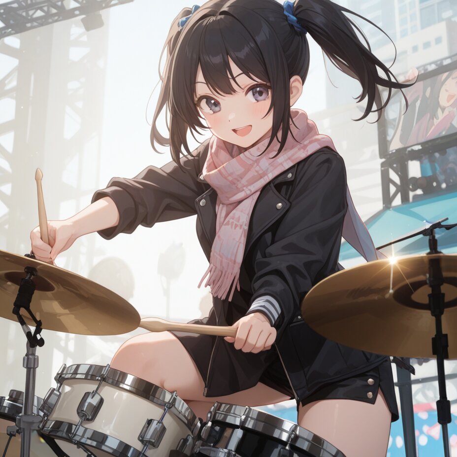 masterpiece, best quality, 1girl, kawaii, open mouth, drummer, hitting the drumset with drumsticks, smile, black hair, twin tails, short hair, wearing a scarf, outdoor stage,