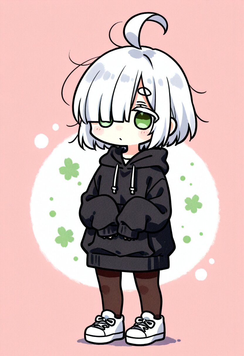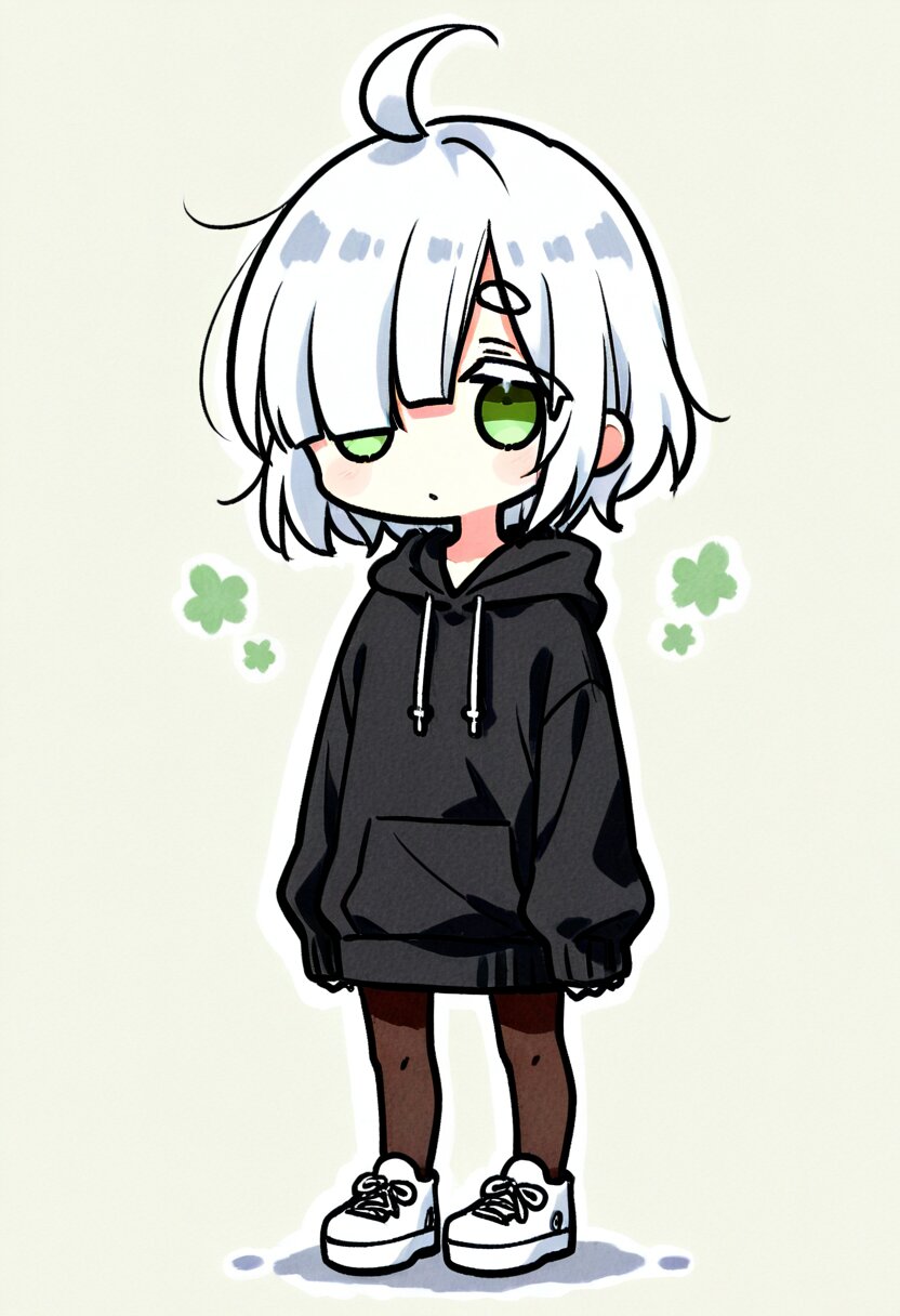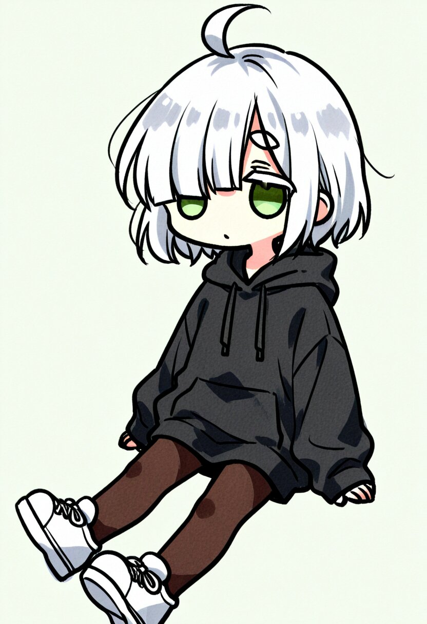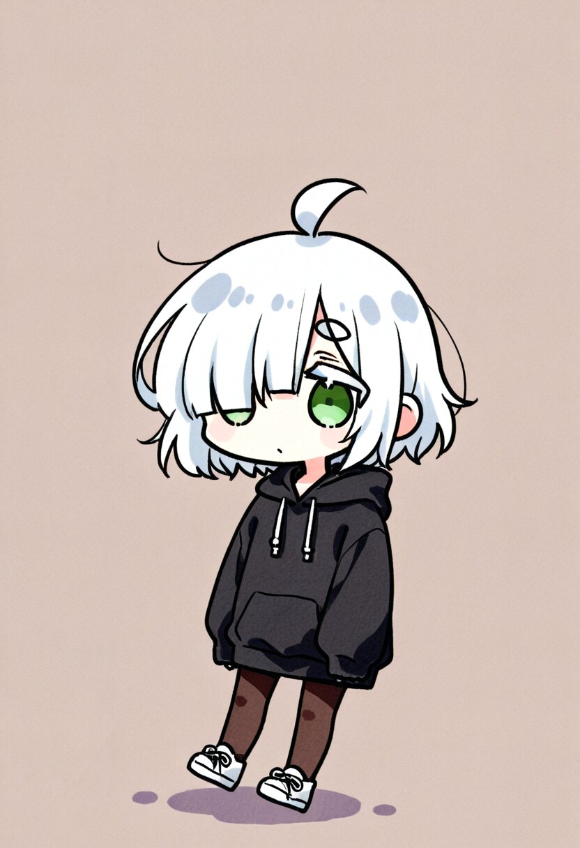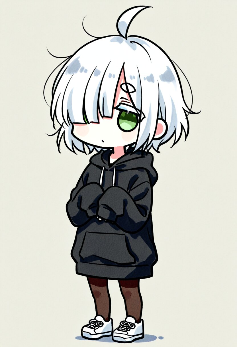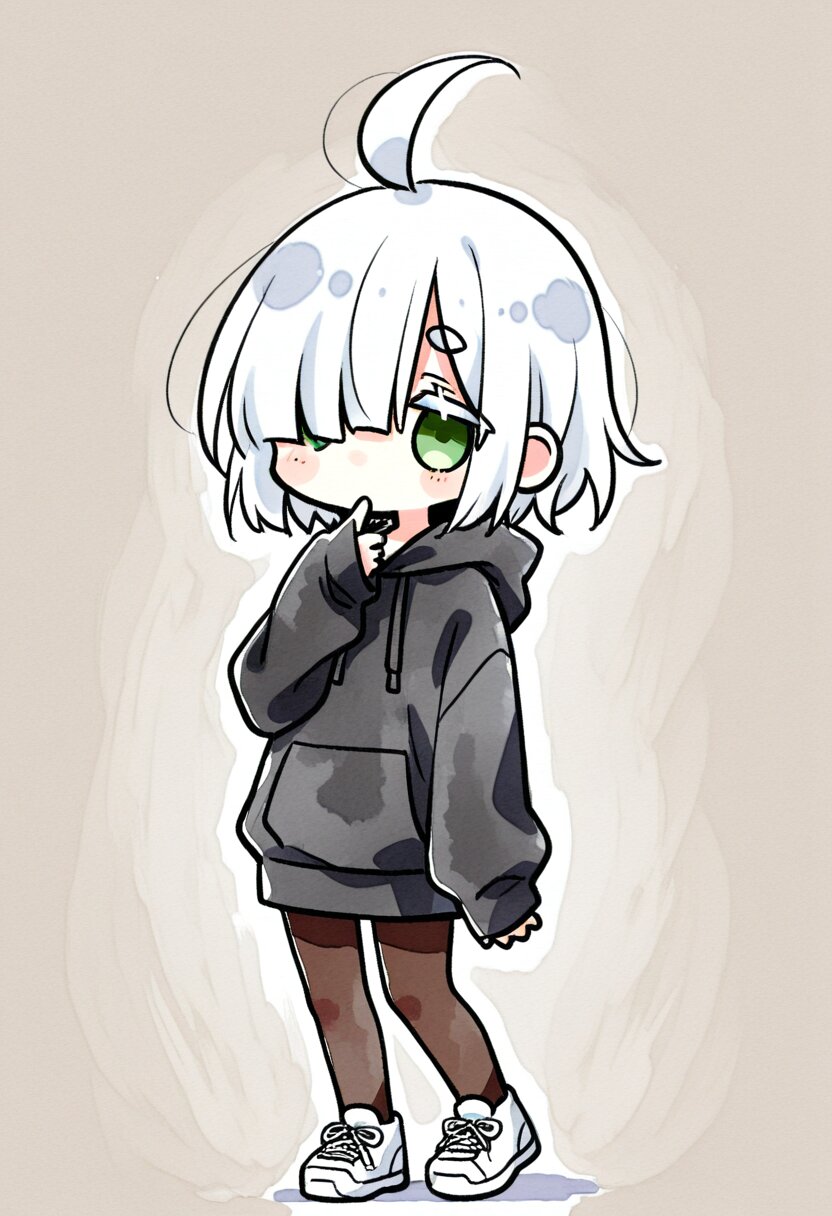 <lora:inmnstyleilxl:0.6>, best quality, masterpiece, very aesthetic, watercolor painting, general, 1girl, chibi, solo, (bright white hair), short hair, blunt bangs, white thick eyebrow, white colored eyelashes, (hair over one eye), ahoge, mint green eyes, oversize black hoodie, sleeves past wrists, brown tights, white sneaker
