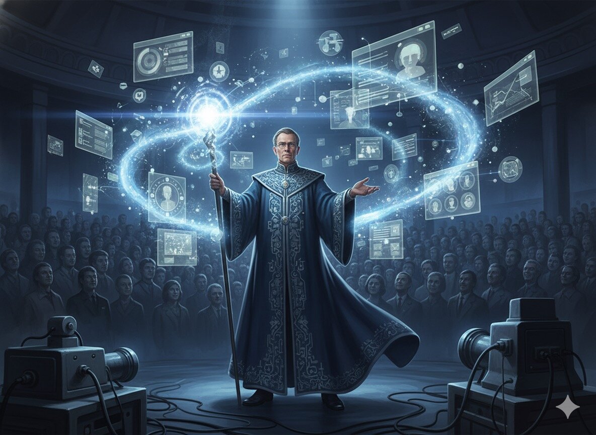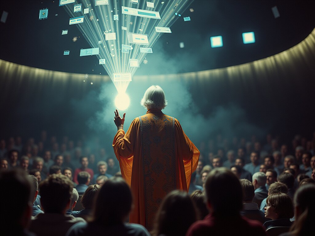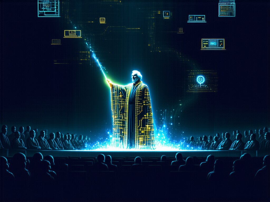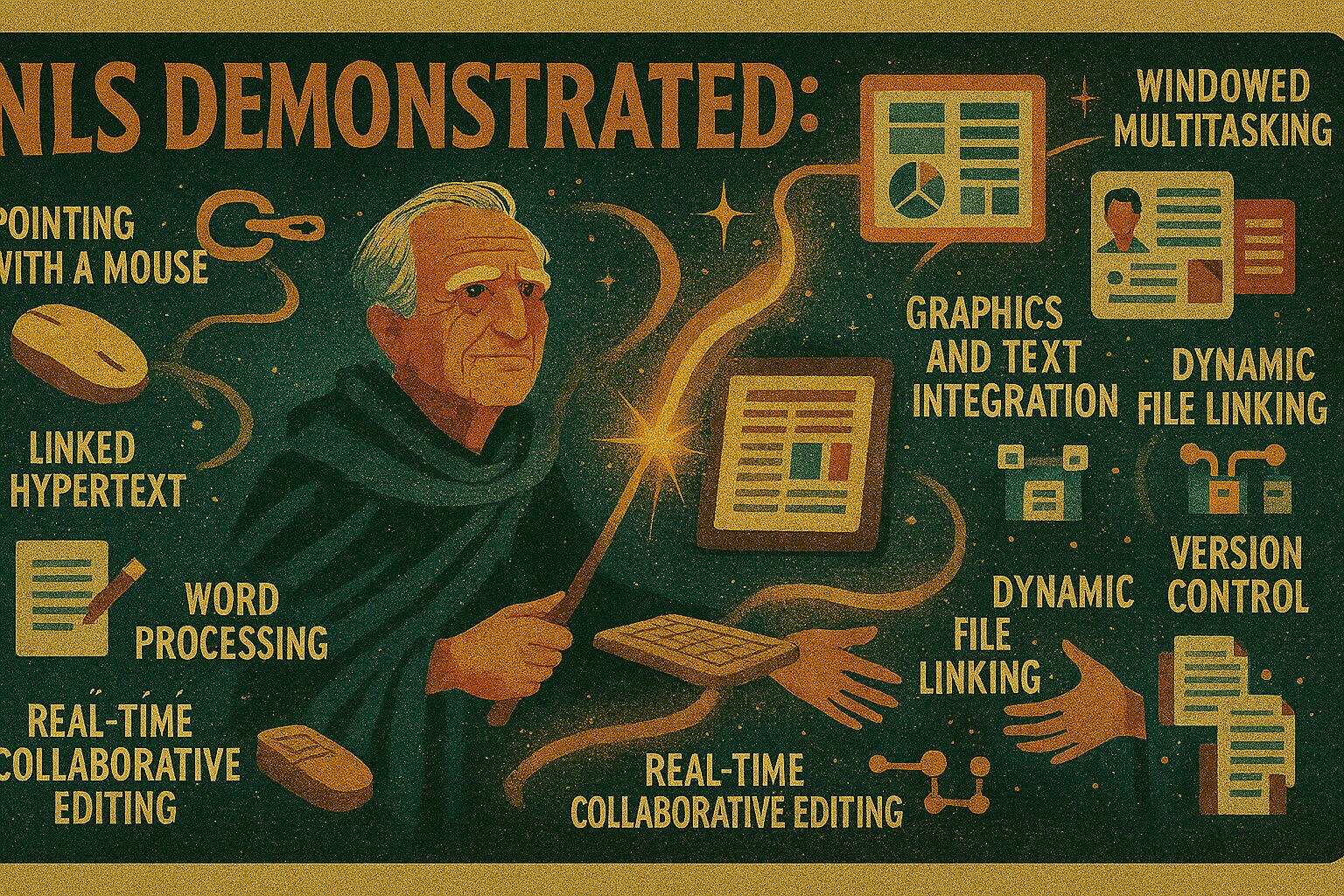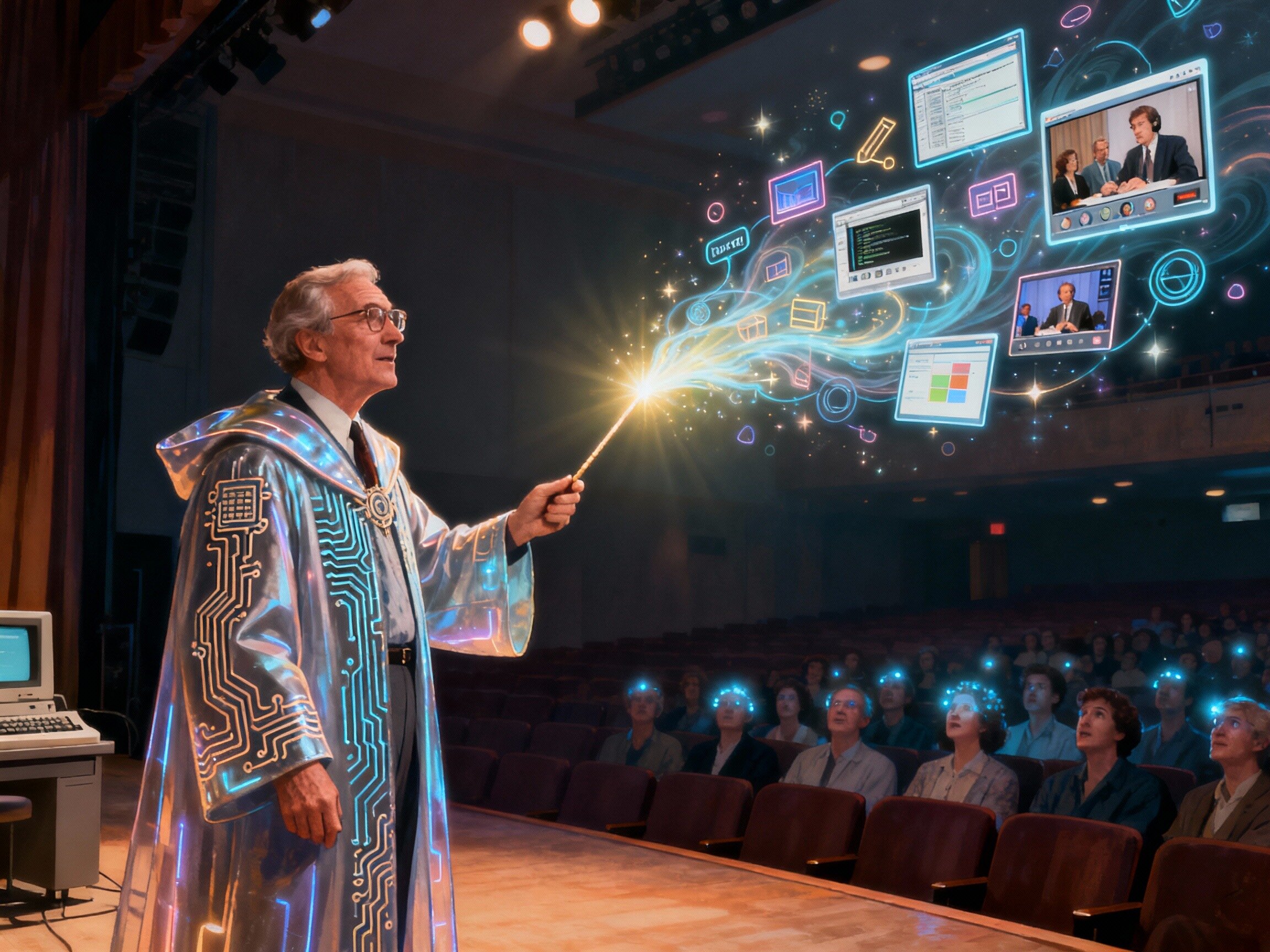 Depict Douglas Engelbart as a symbolic and artistic embodiment of the technological magician. Standing in a dimly lit auditorium, he wears a futuristic robe embroidered with circuit-like patterns, holding a glowing wand. From the wand emanates a stream of radiant light, forming floating windows, hypertext links, collaborative editing scenes, video conference portals, and graphical interfaces. These elements swirl around him like magical symbols, illuminating the space. Behind him, a faint audience watches in awe. Their faces are lit by the glow of innovation. The atmosphere is mystical yet rooted in a retro-futuristic aesthetic, blending 1960s technology with magical symbolism.