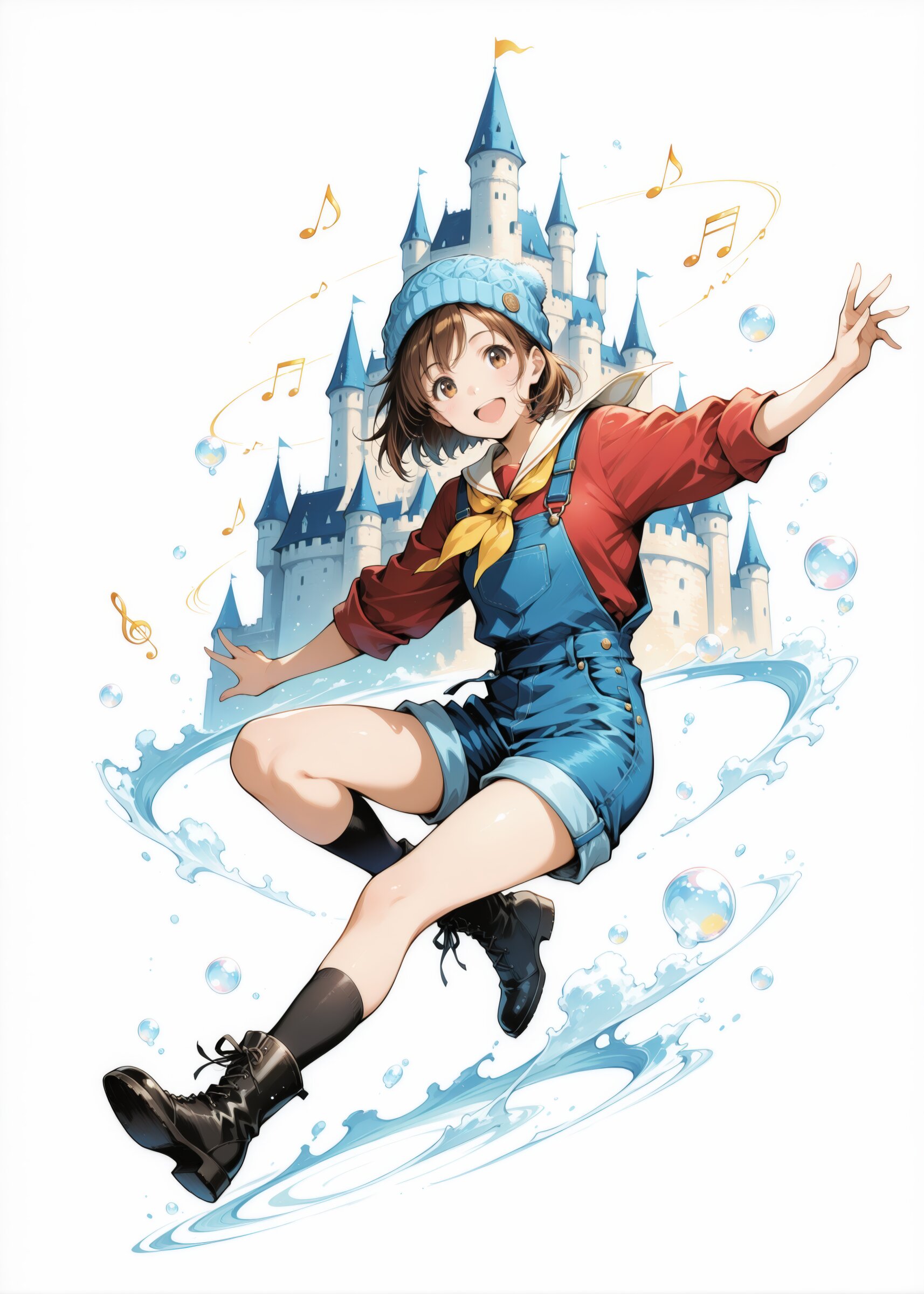 Best quality, Masterpieces, simple background, negative space, anime-style illustration, white background, fine detail, solo, 1girl, Brown hair, short hair, blue overalls, red shirt, (blue knit cap), yellow neckerchief, black boots, black socks, knees, bubbles, smile, open mouth, dynamic pose, cinematic angle, official wallpaper, castle, music wave background, soft lines and music notes, minimal, light background, Soap bubbles