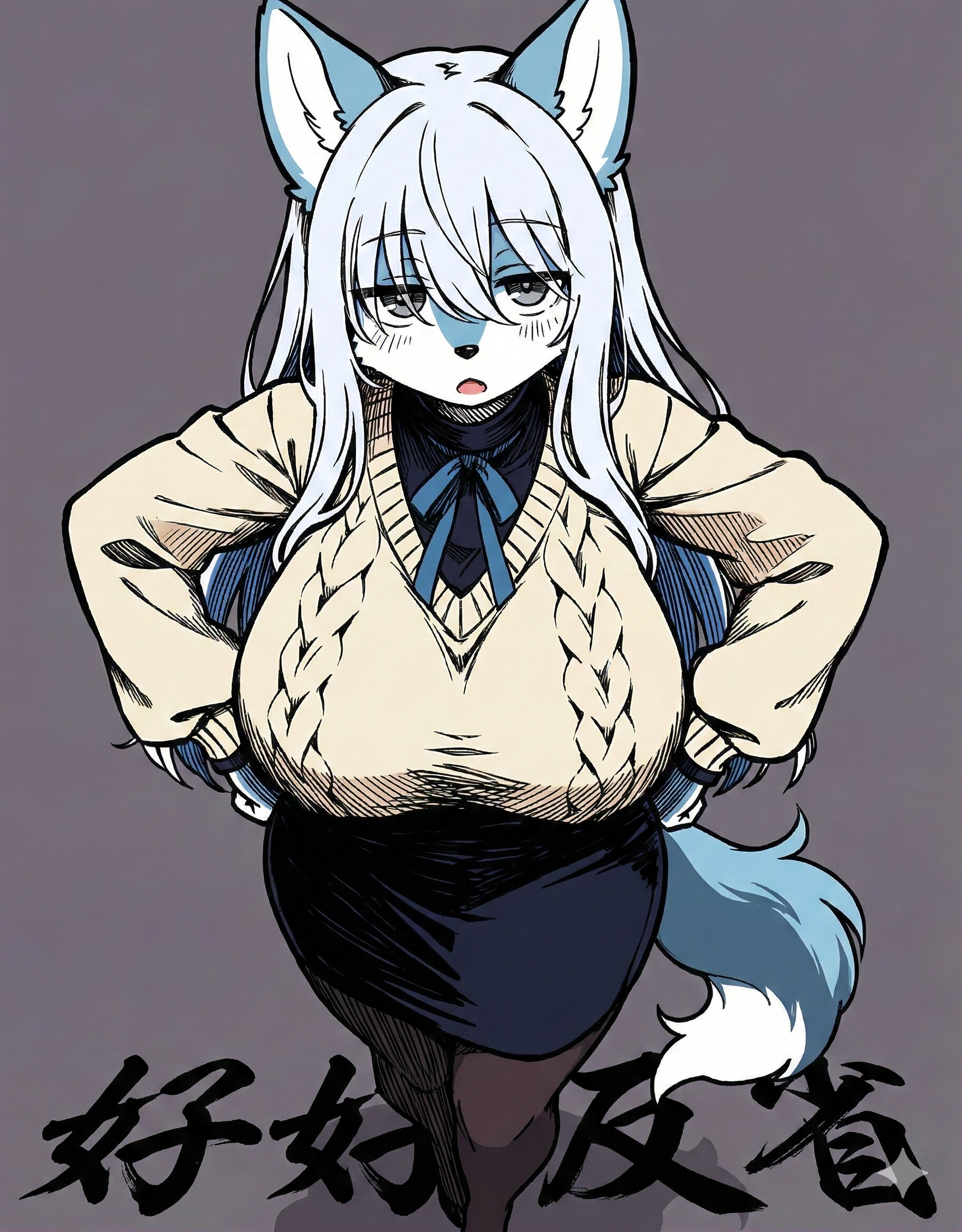 1girl, wolf girl, furry female, (snout:1.3), blue fur, wolf ears, ears up, wolf tail, body fur, fluffy fur, (gigantic breasts), sagging breasts, slim, narrow waist, wide hips, thick thighs, silver hair, hime-cut, long hair, colored inner hair, hair over eyes, hair between eyes, silver eyes, half-closed eyes, long bangs, expressionless, unemotional, light-open mouth, revealing clothes, undersized clothes, high collar, black collar, blue neck ribbon with loose ends, layering, separated turtleneck and sweater vest, v-neck beige sweater, aran sweater, black turtleneck under sweater, long sleeves, black skirt, pencil skirt, black pantyhose, looking up, heel up, hands on own hips, from front, from above, high angle, dynamic pose, gray background, simple background, hair shade, ((high contrast)), (digital art:1.1), anime coloring, kawaii, softy, 2D, cute, furry, two tone fur, furry body, perfect body, detailed face, high quality, cute clothes, animal tail, animal ears, solo, masterpiece, ((correct_anatomy)), pretty and cute, comical, simple, anime, bright colors, contour line, pale painting, gddw, (detailed_hands:1.5), flat color, no lineart, close-up, eye focus