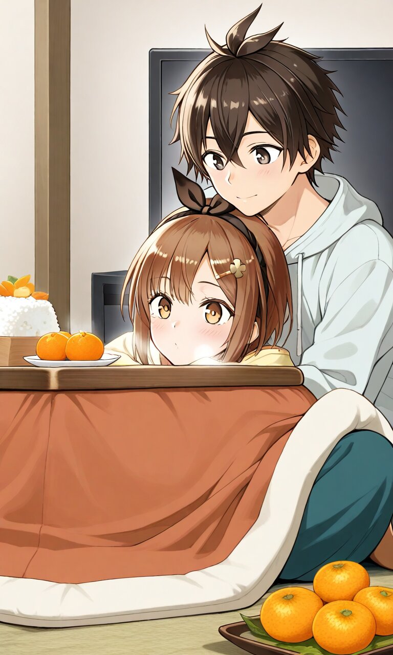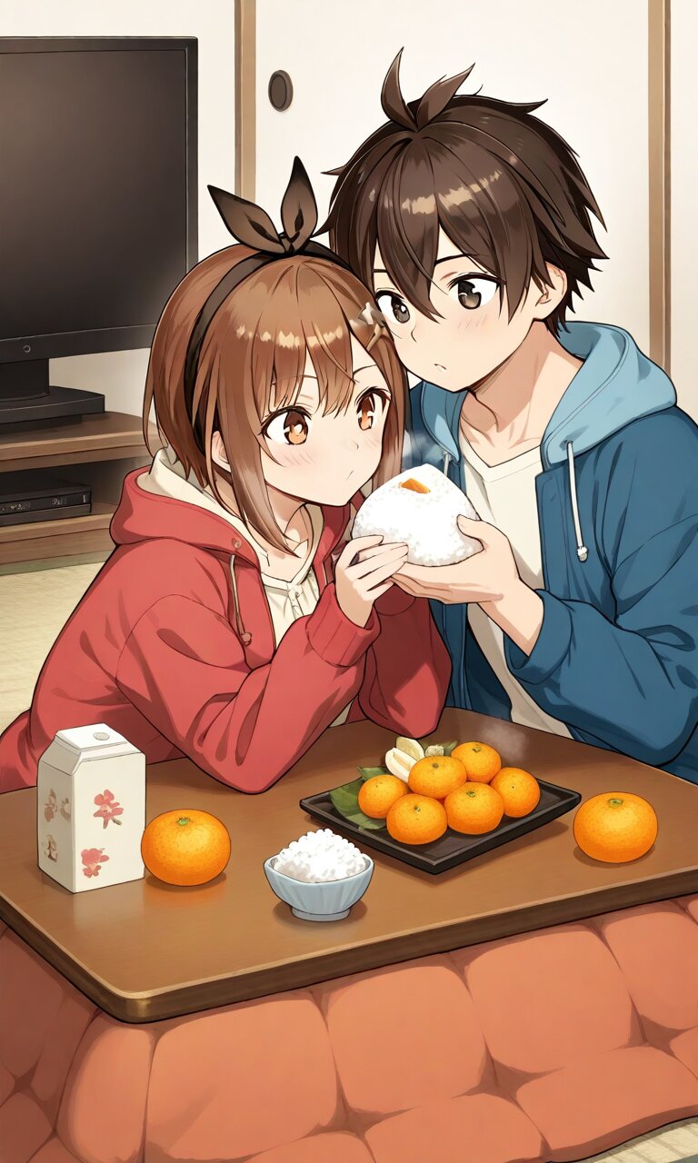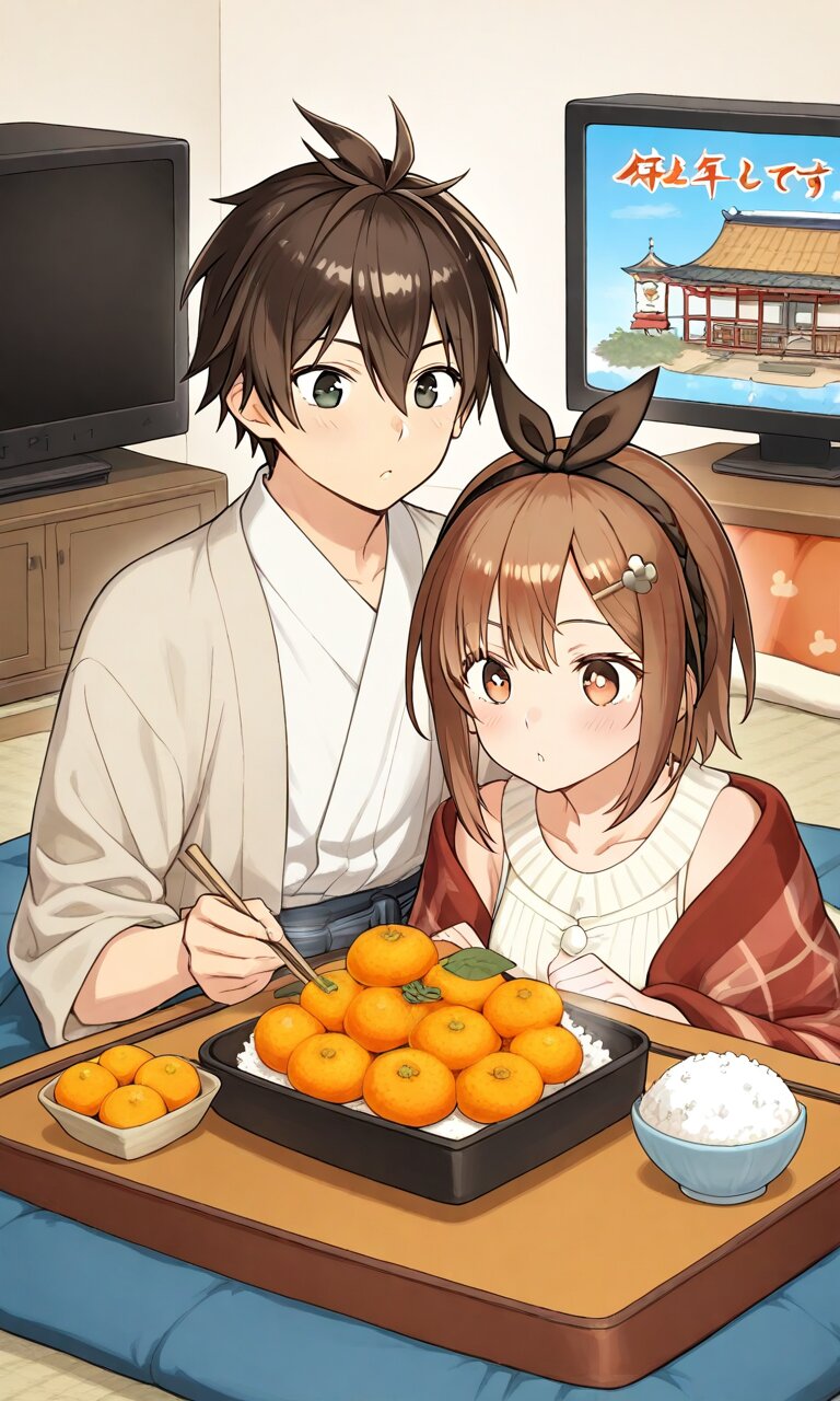 Couple, boy and girl, two people only,absurdres, ultra-detailed, master piece, high resolution, 8k, Boy, girl, couple,New Year's, kotatsu, rice cakes, television, mandarin oranges BREAK the boy(original boy,black eyes, black short hair) BREAK the girl(reisalin stout, short hair, brown hair, hair ornament, brown eyes, hairclip, large breaths ),