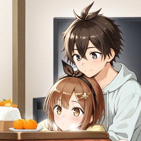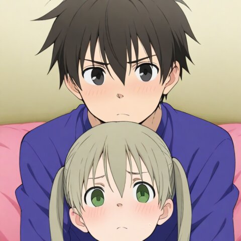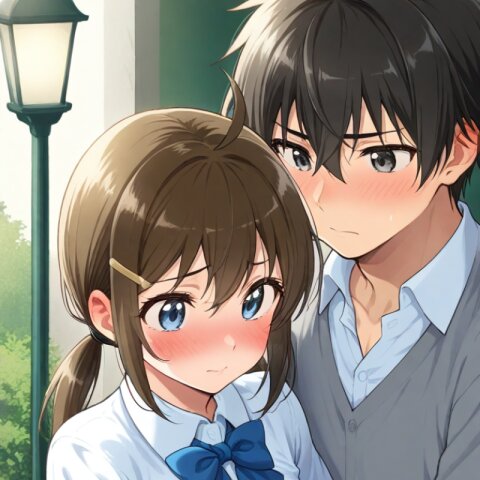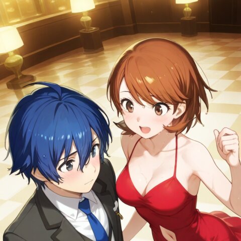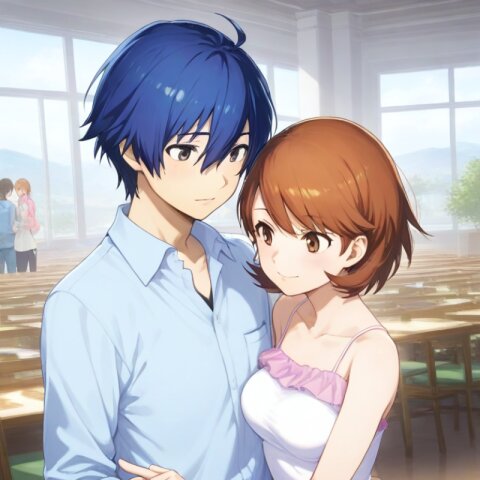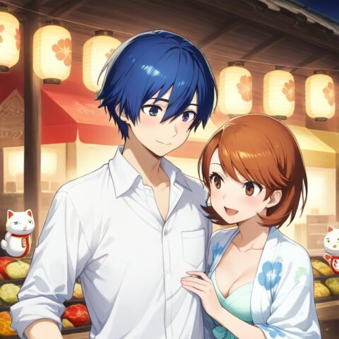 Couple, boy and girl, two people only,absurdres, ultra-detailed, master piece, high resolution, 8k, Boy, girl, couple,masterpiece, best quality, extremely detailed, couple walking hand-in-hand on wooden corridor of old ryokan at dusk, woman in pale blue yukata with loose obi, hair slightly wet, man in dark indigo yukata, paper lanterns glowing orange, tatami and shoji screens, warm romantic atmosphere, perfect anatomy BREAK the boy(original boy,black eyes, black short hair) BREAK the girl(reisalin stout, short hair, brown hair, hair ornament, brown eyes, hairclip, large breaths ),