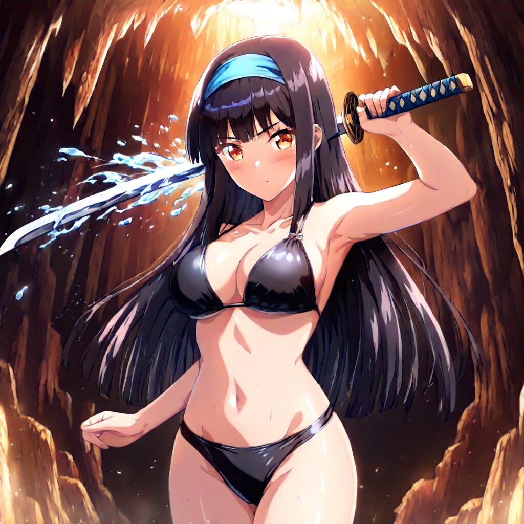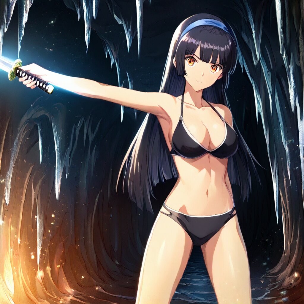 ((masterpiece)), ((best quality)), (ultra-detailed),anime style,cowboy shot, Dark underground cave, stalactites, water droplets,a cute girl, 1girl, large bust, ((Black bikini)), beautiful black hair, beautiful orange eyes, ((beautiful eyes)),straight hair, (blunt hair), ((blue hairband)), Holding a weapon in hand, gripping katana