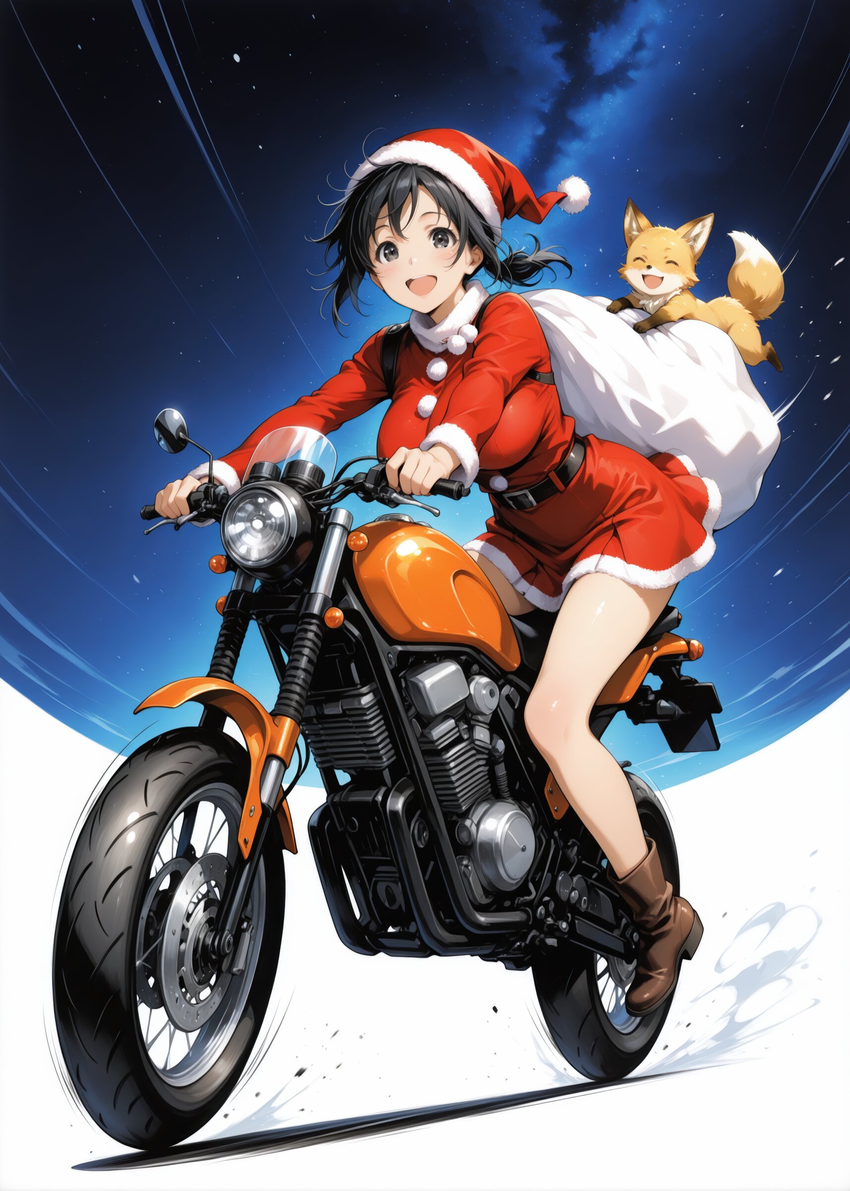 Best quality, Masterpieces, simple background, negative space, anime-style illustration, white background, fine detail, 1girl and 1animal, sit astride a motorbike, sence of speed, speed lines, 1girl, (young girl), cute face and eyes, big breasts, black hair, clear black eyes, single short ponytail hair, cute and lovely, Vigorous, lively, and spontaneous personality, smile, open mouth, santa costume santa hat miniskirt, A girl riding a motorcycle at incredible speed, the rush of speed, leaning forward, Christmas presents piled high, hair fluttering in the wind, a pace no one can match, exhaust heat, from side, happy, cute small fox cub, cinematic angle, dynamic pose, official art, official wallpaper, stop motion, motion blur, motion lines, at night, night sky,