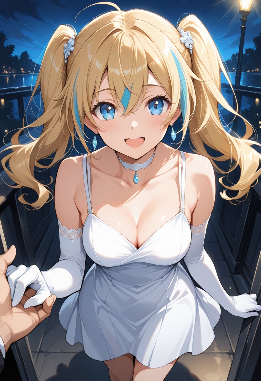 masterpiece,best quality,amazing quality,general, fine detail, official art, 1girl, cute face, twintails, long hair, blue eyes, blonde hair, blue streaked hair, ahoge,bangs between eyes, slightly open mouth, cleavage, medium breasts, bangs, (beautiful eyes), close-up portrait, shy seductive expression, detailed face, delicate skin texture, anime style, extremely detailed, soft shadows, 1girl, white dress, sleeveless dress, collarbone, bare shoulders, bare arms, earrings, white elbow gloves, white choker, white high heels, hair ornament, solo, smile, looking at viewer, jewelry, :d, solo focus, night, pov, sky, best quality, high resolution, masterpiece, standing, greeting, ((nice hands, perfect hands)), feel happy, happy face, delight face, happy, ((cinematic lighting)), dark lights,