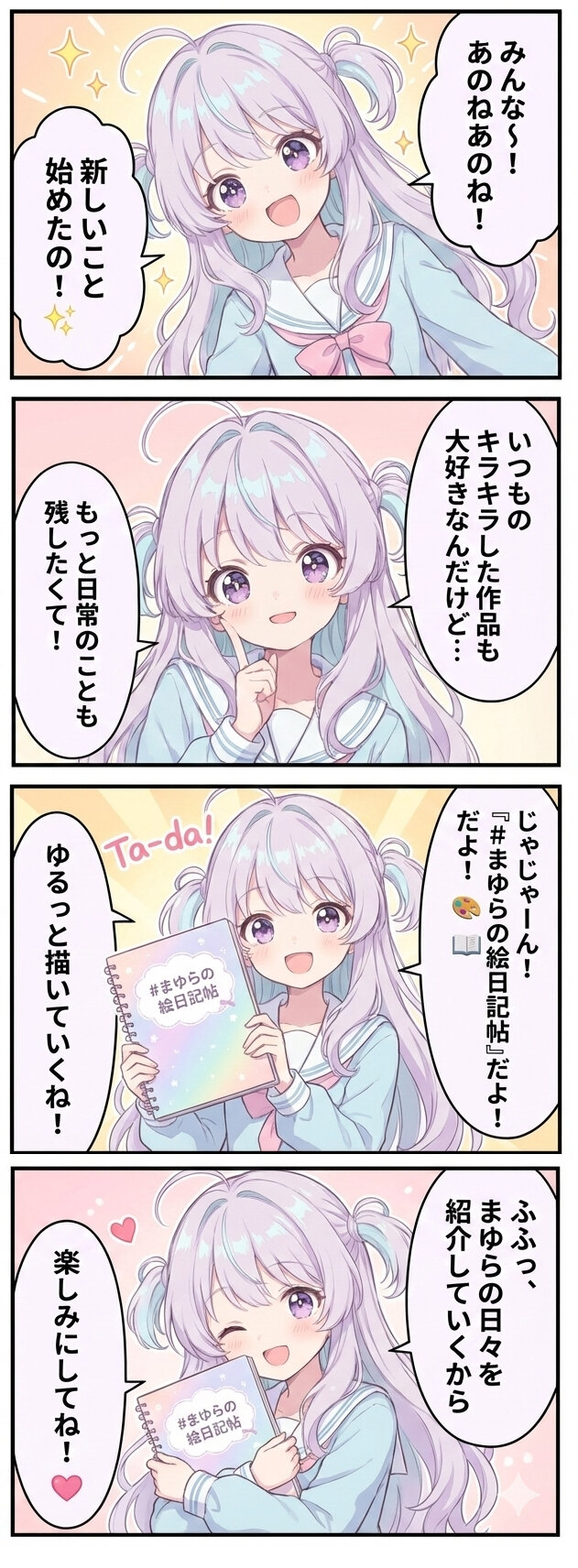 まゆらの絵日記帖003 藍野まゆら 2025/12/5使用したAI Gemini/Nano Banana 年齢制限 全年齢 いいね1 シェア #藍野まゆら #まゆらの絵日記帖 プロンプト なし コメント 送信 藍野まゆら 2024年4月より活動開始 213投稿131フォロー120フォロワー はーい!藍野まゆらだよ〜!✨ AIアート好きな女の子です。紫の髪に水色のインナーカラーがチャームポイント! ゆめかわいいイラストを描くのが大好きで、毎日AIアートで遊んでるよ。 星やお菓子、パステルカラーがお気に入り☆彡 みんなで一緒にAIアートの素敵な世界を冒険したいな! よろしくね〜!🎨💖 フォローする 他の作品 全てを見る まゆらの絵日記帖002 まゆらの絵日記帖001 よろこんでくれるといいな きらめきを飾る午後 私が望むハッピーエンド! ドキッとした? 大天使の魔法🌟 完璧な帽子❓👒 AIファンアート強化週間2025.11 頑張ったみんなへ まったりタイム ルミナリンク3面図📖 金曜チアでエール届けるよ!📣✨ ポッキーの日🍫 冬のぬくもりをありがとう ゆきいろデニム ぼうしと冬のそら 冬の街角で、あたたかく✨ もっと見る