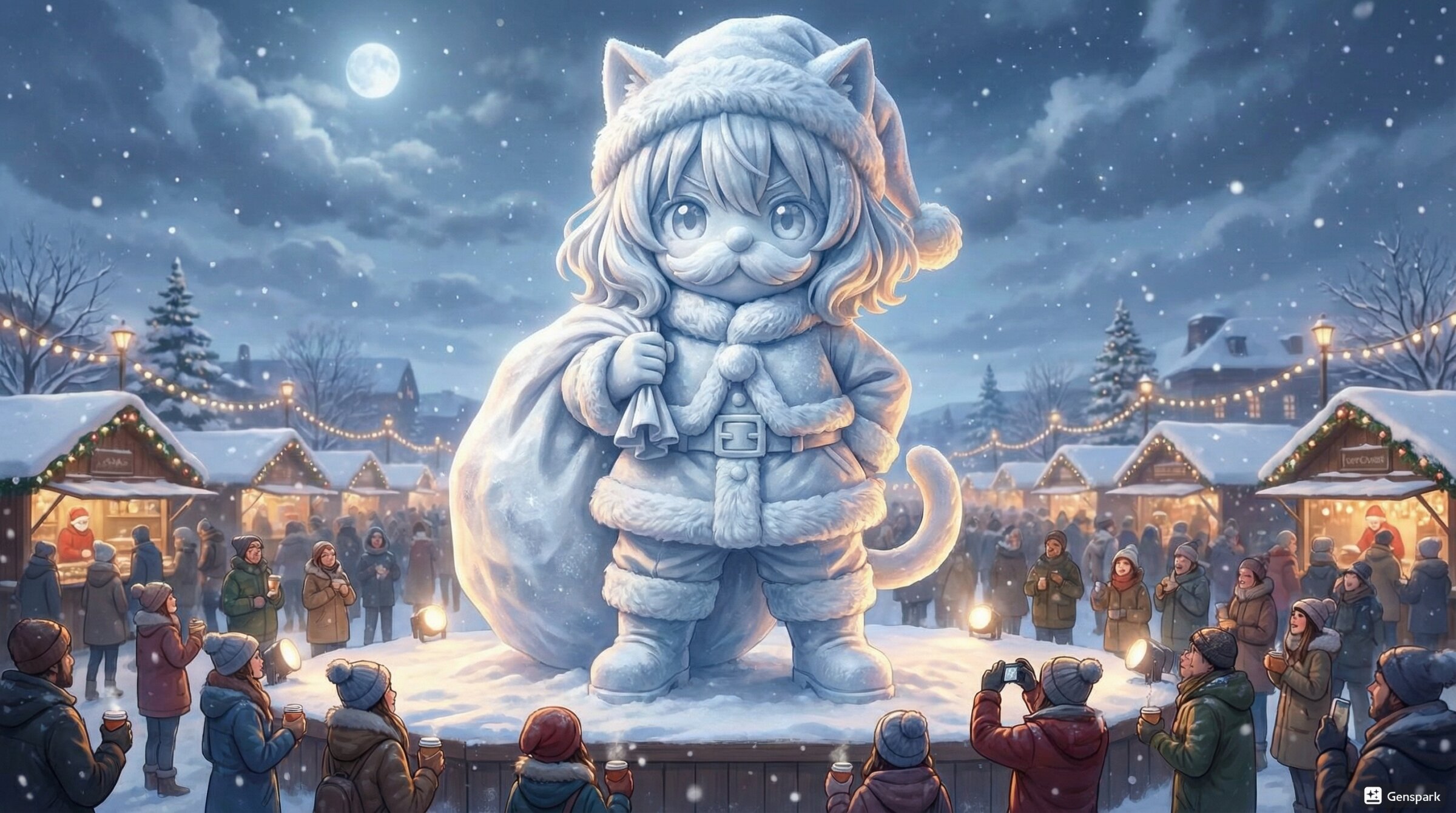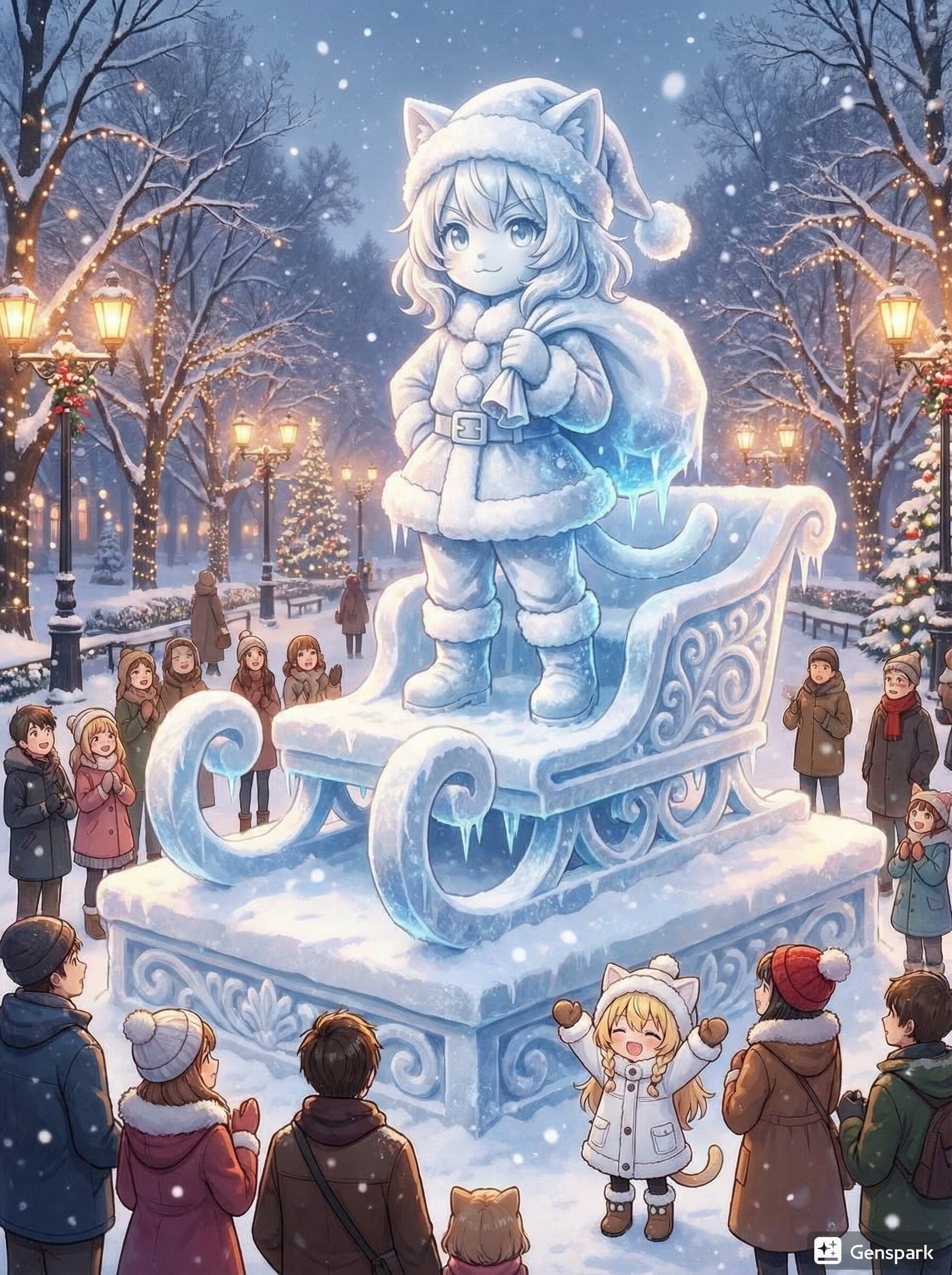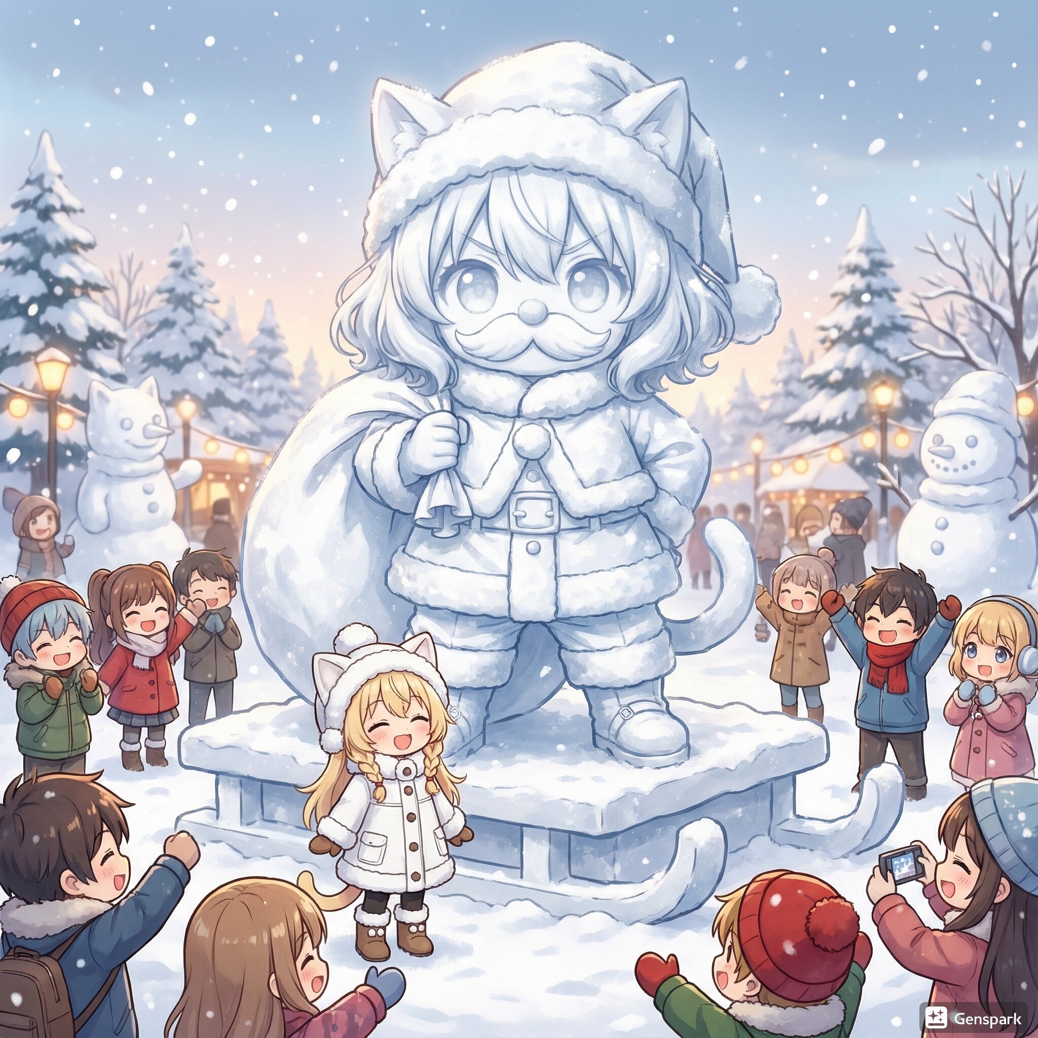 このキャラを雪像(リアル・巨大・精巧・ソリ型の雪製台座)の写真にして。背景は雪像にふさわしい舞台。雪像の足元に雪像に向いた群衆がいる。