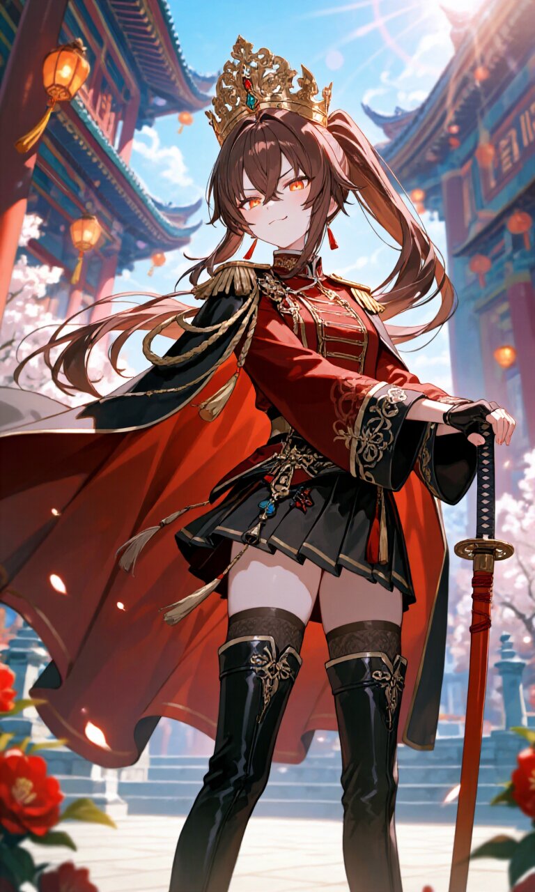 A 15-year-old girl with delicate features stands proudly in a Chinese palace courtyard, her brown hair styled in a long ponytail with crossed bangs framing her determined face. Her orange slanted eyes glow with confidence beneath an extravagant oriental crown, while V-shaped brows accentuate her smug expression. She wears a dark red luxurious prince costume with long sleeves, epaulettes, and gold trim, layered under a black oriental cape that billows dramatically. The ensemble includes a black mini skirt with intricate gold embroidery, thigh-high black boots with ornate detailing, and fingerless black gloves that highlight her delicate hands resting on the hilt of a Chinese katana at her waist. The afternoon sunlight filters through blossoming Chinese flowers, casting lens flares across the blue sky as shining lights illuminate the romantic academia atmosphere. Every element—from the woven gold patterns on her costume to the individual strands of hair escaping her ponytail—is rendered with insanely detailed precision, emphasizing the luxurious textures of silk, metal, and polished leather. The composition balances her petite frame against the grand Chinese architecture, using depth of field to highlight both her brave pose and the intricate palace surroundings in this 16k masterpiece of oriental fantasy.