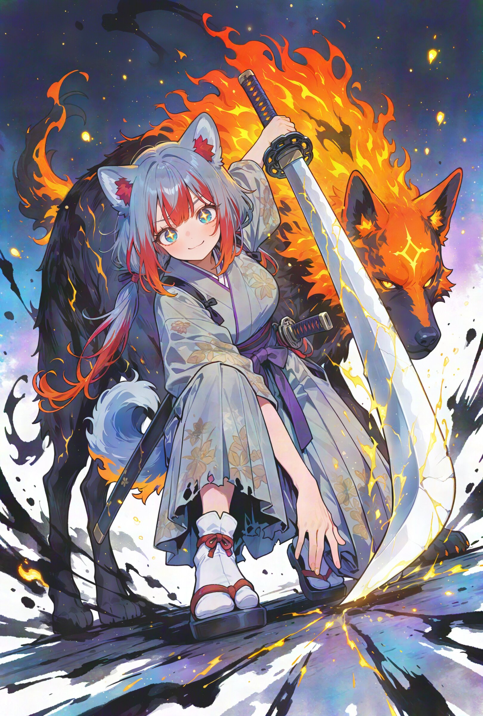 foreshortening, (close up:1.0) looking at viewer, dynamic angle, weapon focus autumn atmosphere, earthy color, glowing amber dog energy, amber silhouette of serious dog guardian, huge dog aura, 1girl, samurai, (muscular female:0.65), multicolored hair, burnt sienna,teal green,red hair, long hair, low twintails wispy bangs , , + +, beautiful darkmagenta eyes large breasts, scar on forehead, ,, ,, (holding Japanese lightgray sword:1.3), scabbard, (antique pattern kimono:1.0), (stylish lightgray japanese helmet:0.5), sakuramon, sandals dog ears, dog tail, tabi, (joyful smile:1.1), , broken weapon, torn clothes, wiping blood (swirling ink effects:1.2) fleeing, beautiful metallic luster, sharp katana, ultra detailed katana, silver particles, light trail, The background is a solid, bright amber, creating a striking contrast with the intricate, multi-colored design of the character, (fighting silhouette:0.0), pop color background, (high saturation:1.2), drop shadow, ink-drenched shadows, solid black shadow blocks, abstract ink swath background, heavy chiaroscuro, high-contrast inky shading, negative space, grunge texture, calligraphic strokes, susuki grass, super fine concept art, hard surface, graceful eyes, masterpiece, best quality, amazing quality, very aesthetic, absurdres, newest, professional art lots of details, , overexposure, sumie effect style, 4ur4_illu,shiny, glowing, glowing particles, glowing light particles, light particles, ice spike, <lora:noline (1):-0.5> <lora:sdxl2-flat2-512b:0.2> <lora:facelightup_xl_v10:0.5> <lora:V2_yakumo_alchemy:0.5> <lora:Aura_illu:0.1>