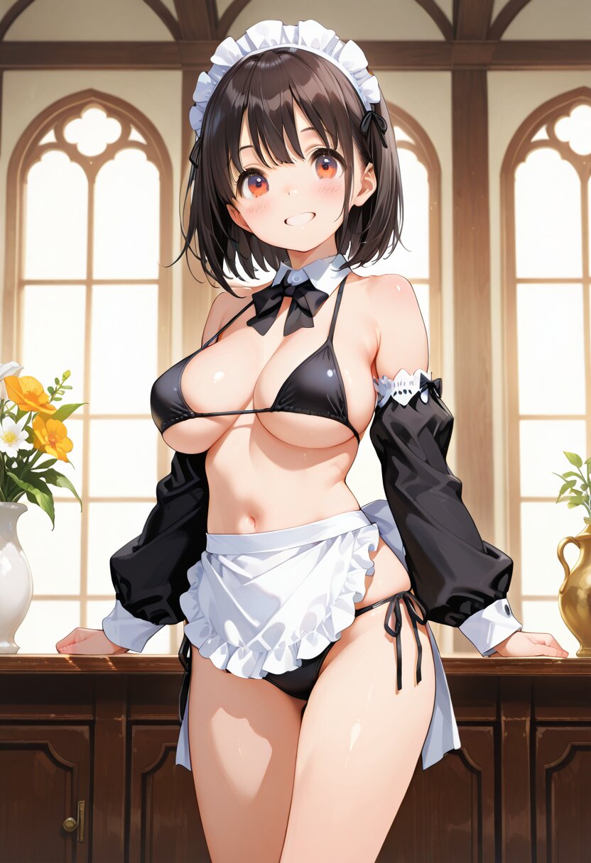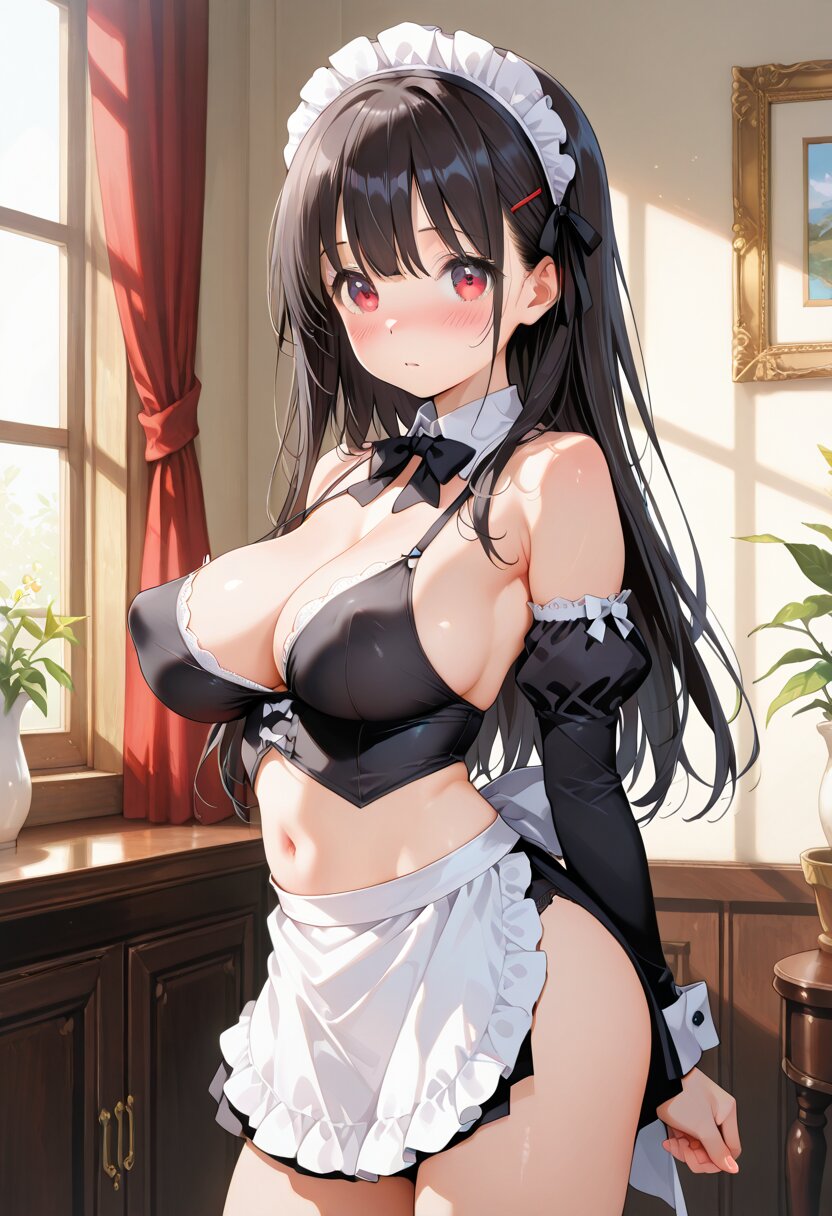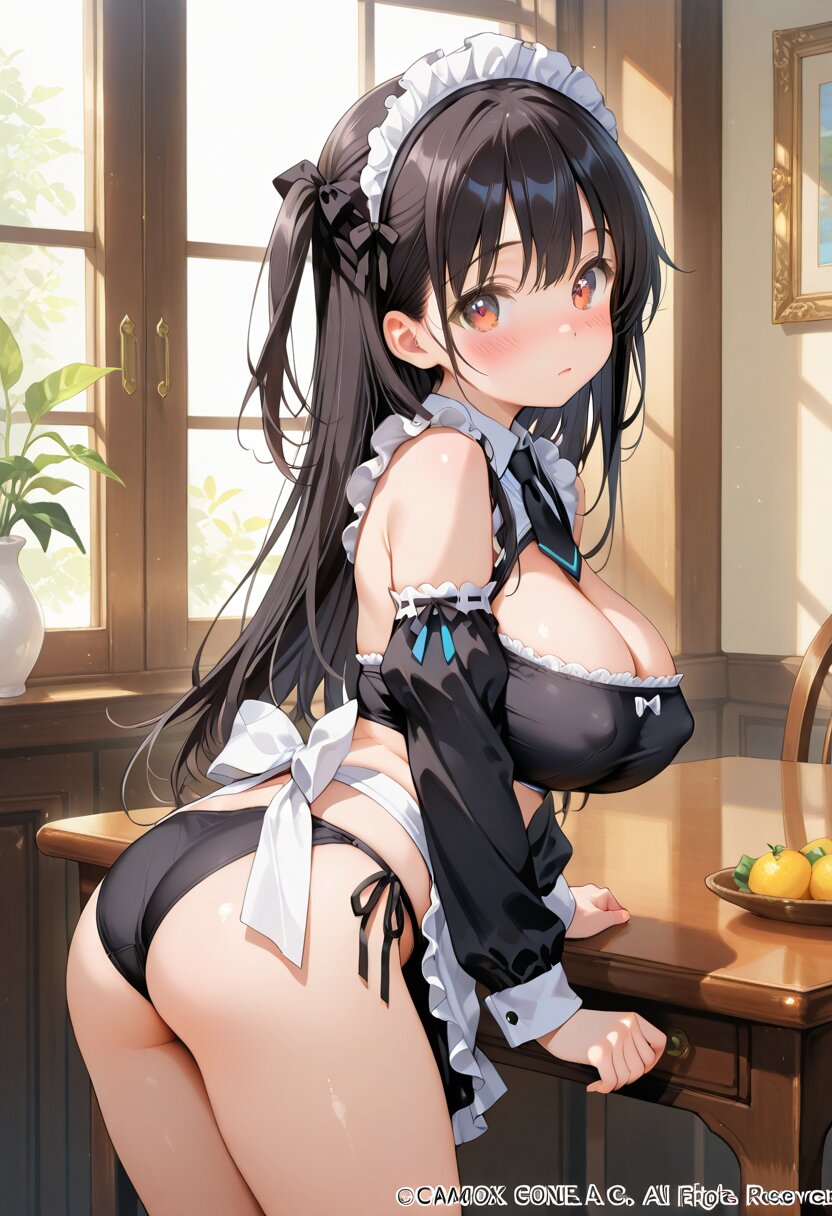 masterpiece, best quality, amazing quality, general, fine detail, official art, 1girl, loli, black maid uniform, detached black sleeves, bare shoulders, breasts cleavage, navel, white waist apron, beautiful legs, big breasts, erect nipples, blush, innocent expression, tie-side pantie, from back, look at viewer, ass,
