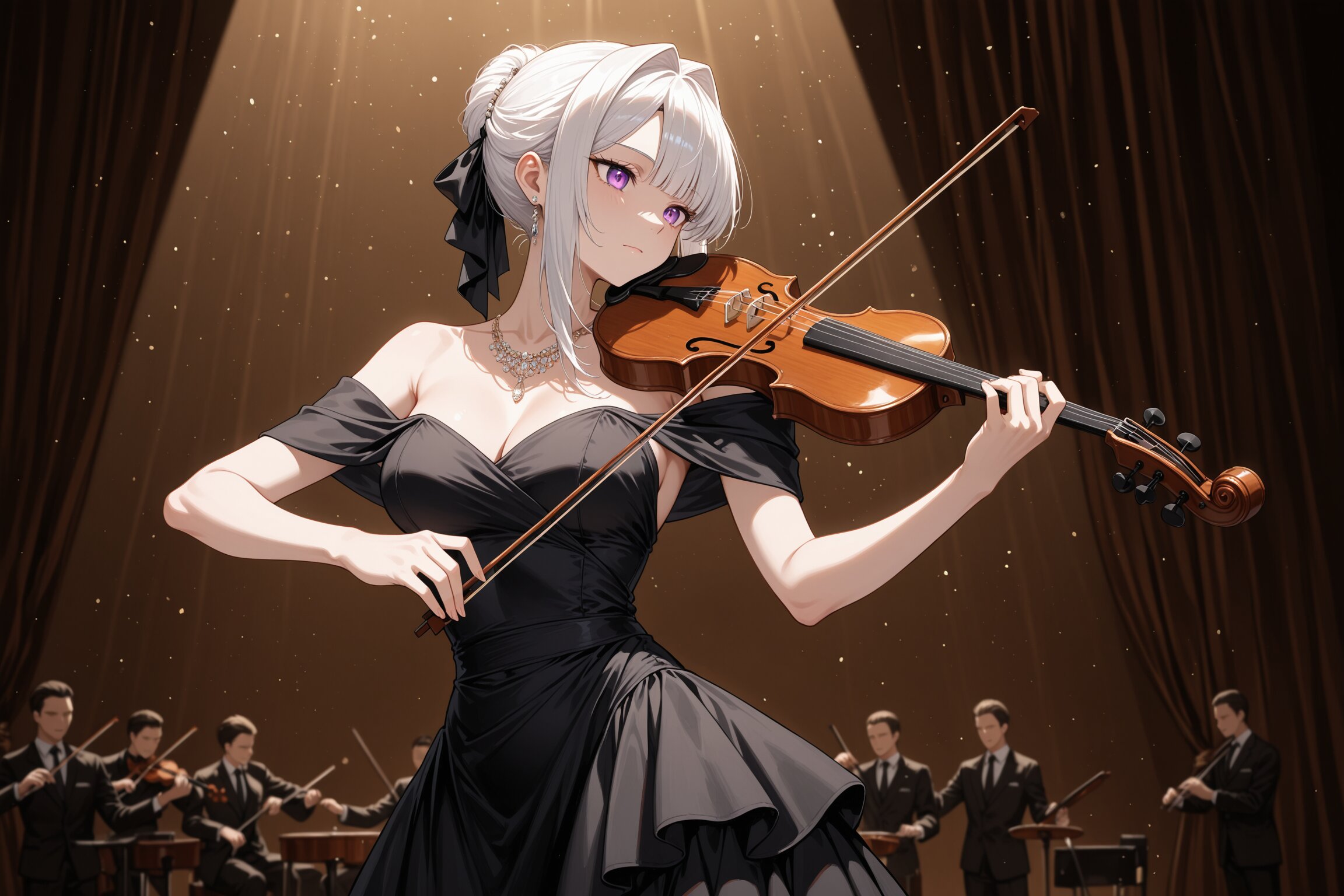 masterpiece, best quality, absurdres, newest, very aesthetic, amazing quality,highres,sensitive, highres, ultra detailed, best anatomy, HDR, 8K, high detail RAW color art, high contrast,blurry background, background orchestra, 1girl, white hair,long hair,purple eyes, bright highlights in eyes,medium breasts, hair slicked back, (hair intakes:1.3), sidelocks, (updo:1.2), asymmetric bangs,hair ribbon, black ribbon, party dress, black dress, off-the-shoulder, structured silhouette, elegant, chic, stilettos, skirt, closed mouth,head tilt, jewelry,side glance,necklace, solo, upper body, playing violin, violin, spotlight,on stage,
