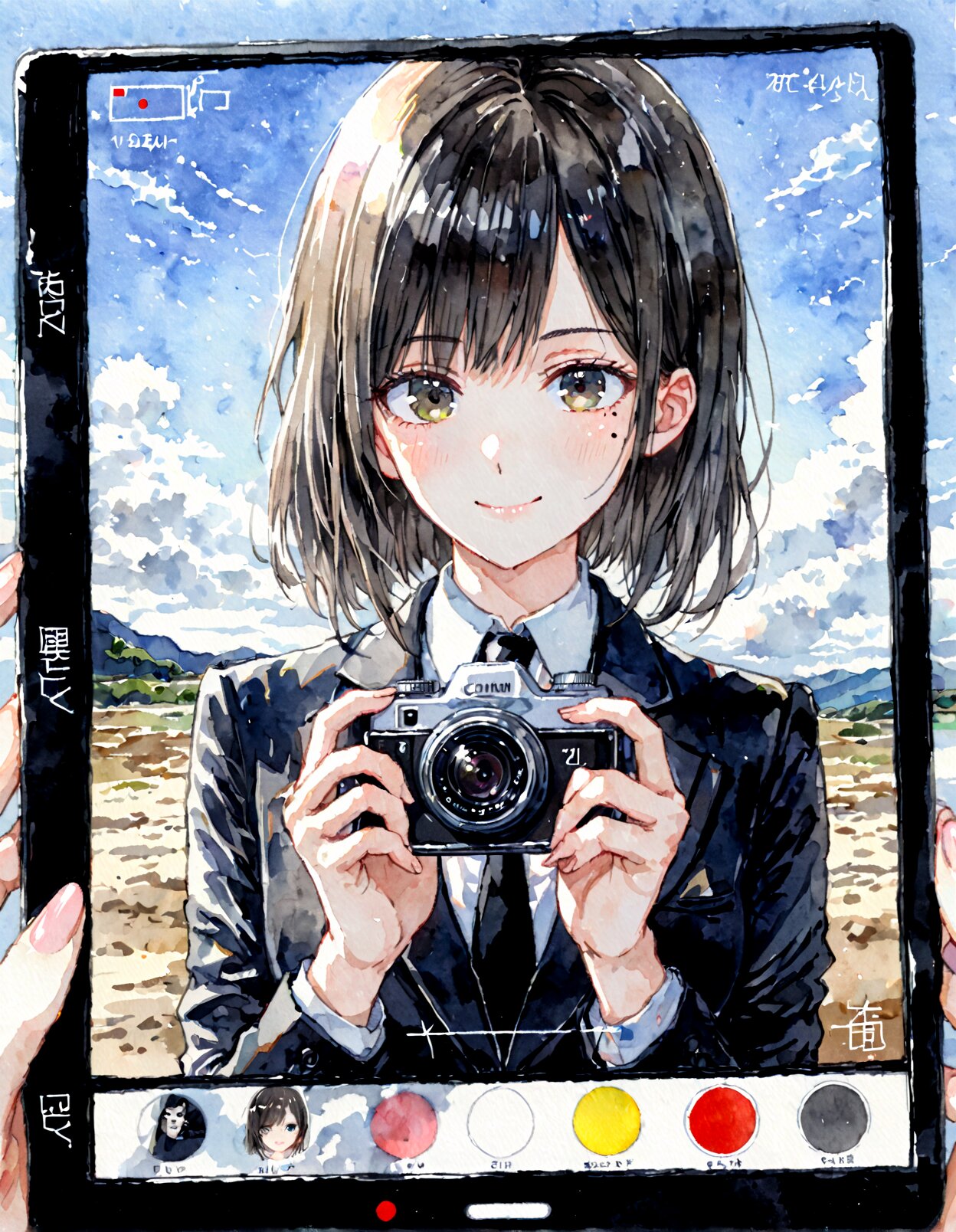 1girl looking viewfinder, holding camera, black suit, black necktie, callored shit, sky, upper body, light smile, watercolour, from behind, beauty detailed eyes, mole under eye, face the camera forward,