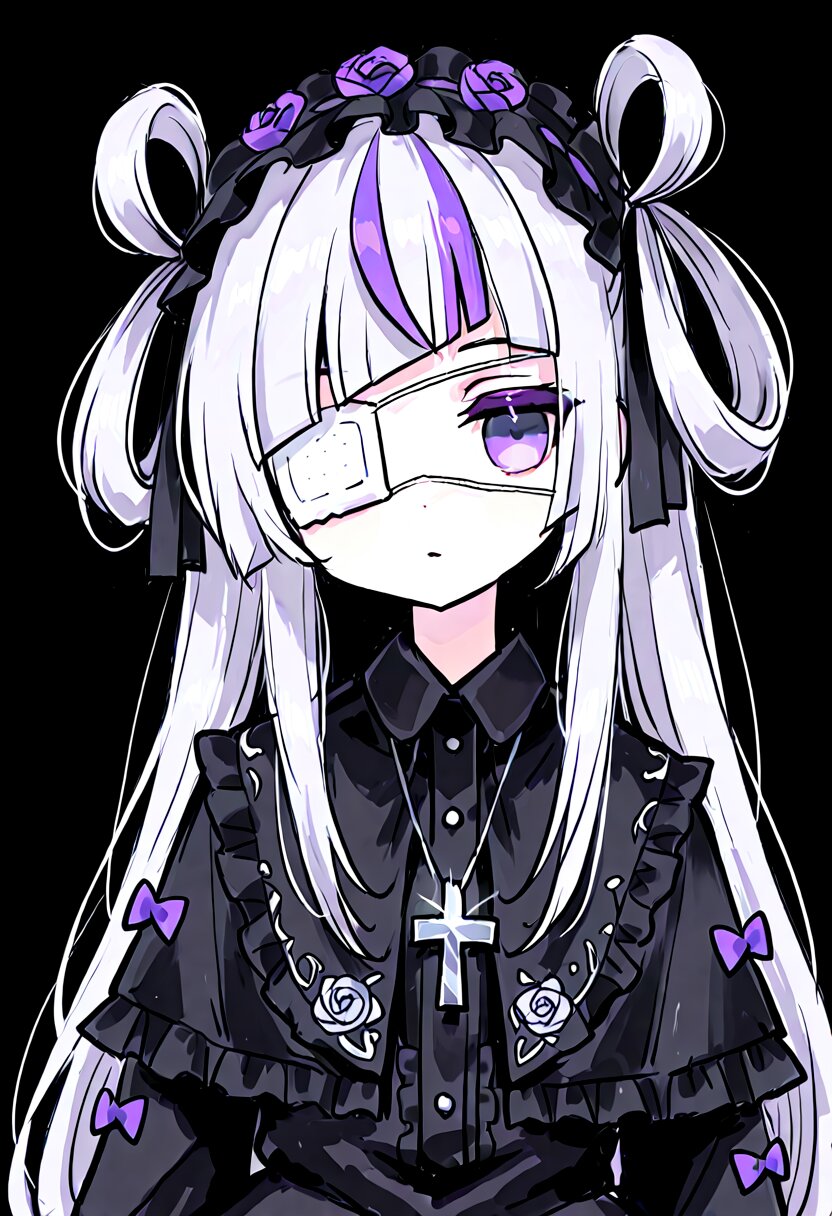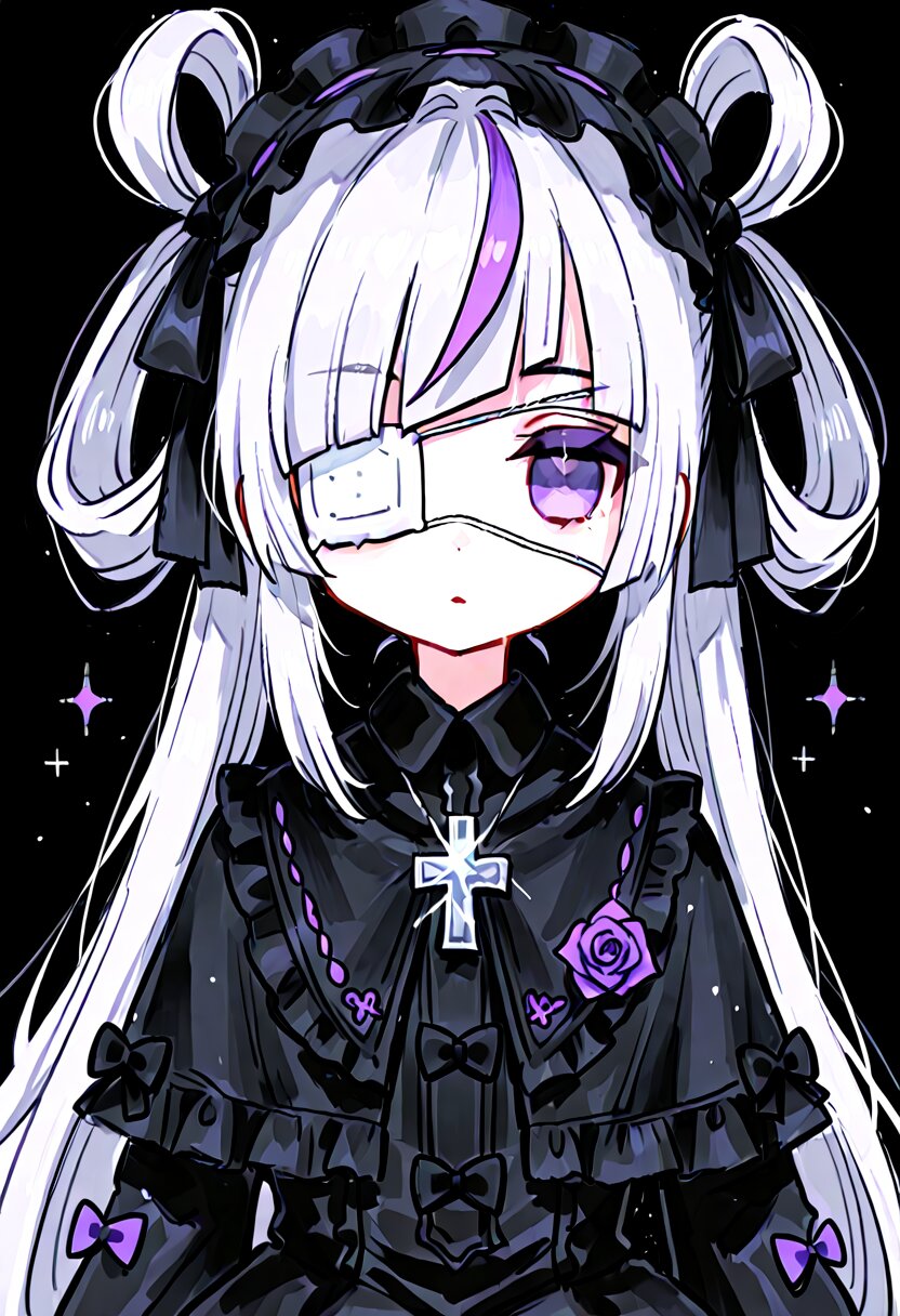 <lora:inmnstyleilxl:0.9>, best quality, masterpiece, very aesthetic, watercolor painting, general, 1girl, solo, necklace with silver cross, cross focus, glint, portrait, silver hair, hair rings, diagonal bangs, purple highlights streaked hair, purple eye, medical eyepatch, gothic lolita fashion, frilly haedwear, frilly black dress, longsleeves, black capelet with rose embroidery, black background