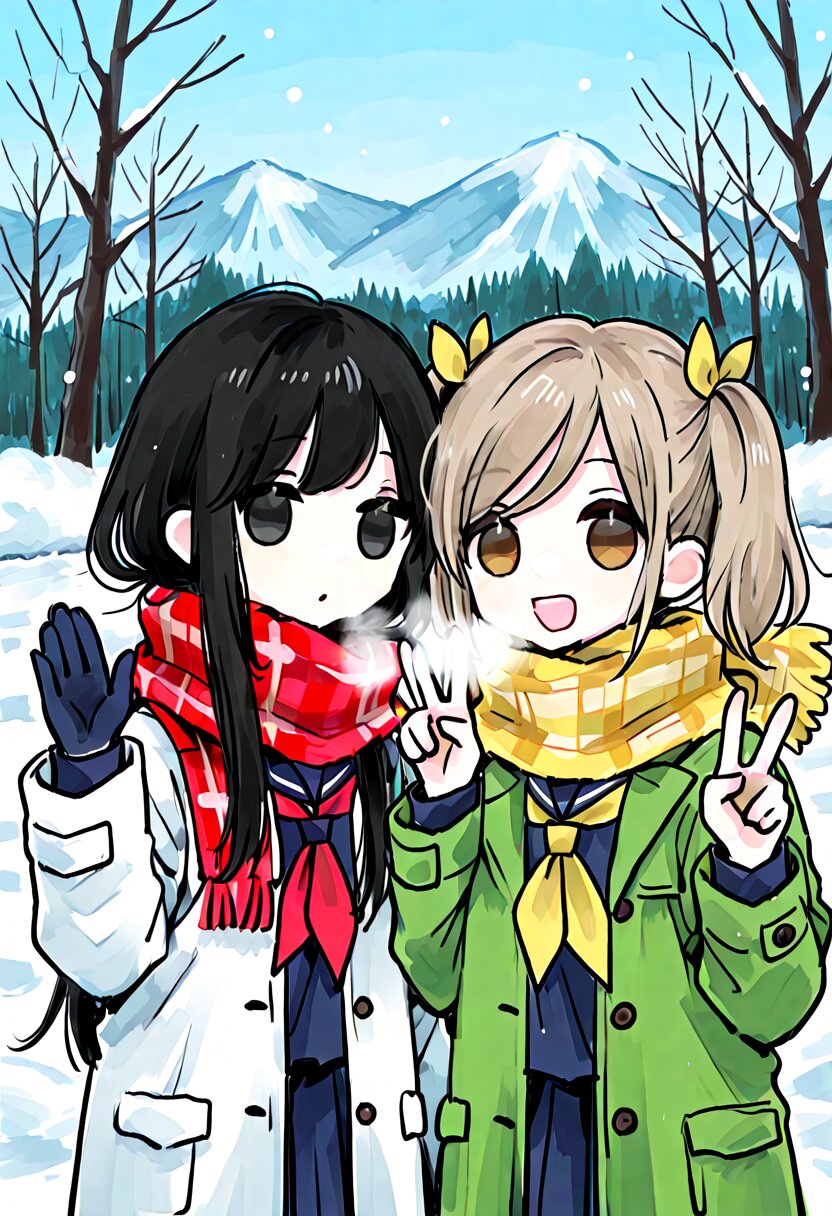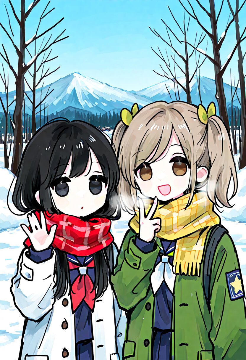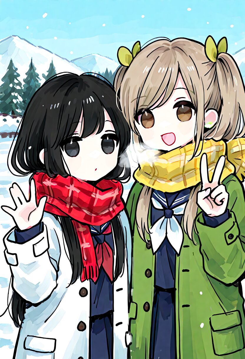 <lora:inmnstyleilxl:0.9>, best quality, masterpiece, very aesthetic, watercolor painting, general, 2girls, winter town, snow, BREAK 2girls, black hair, long hair, black eyes, red plaid scarf, navy sailor suit, white duffle coat, front open coat, smile, waving, upper body, winter town, snow, BREAK 2girls, light brown hair, twintails, brown eyes, yellow plaid scarf, navy sailor suit, green duffle coat, front open coat, smile, open mouth, v, white breath, upper body, winter town, snow