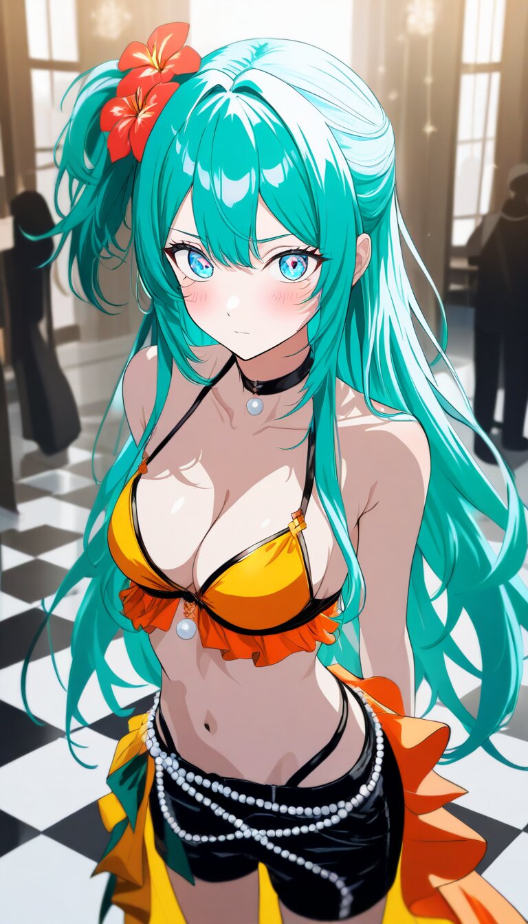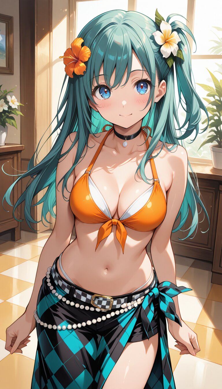 masterpiece,best quality,amazing quality,general, fine detail, official art, 1girl, cute face, long hair, one side up, Anime-style girl, teal hair, flower hair ornament, orange-white bikini top, black shorts, tropical sarong, pearl belt, choker, confident, indoor, checkered floor, vibrant. medium breasts, blush, solo focus, bangs, (blue eyes, beautiful eyes), teenage, medium breasts, cleavage,