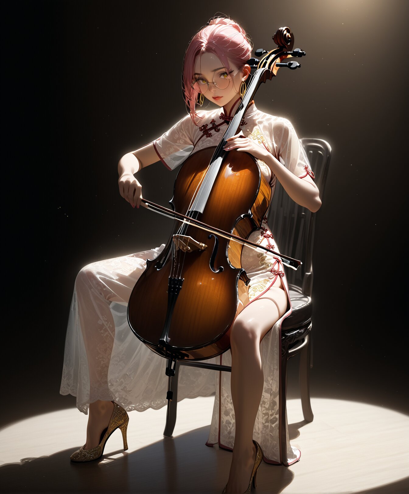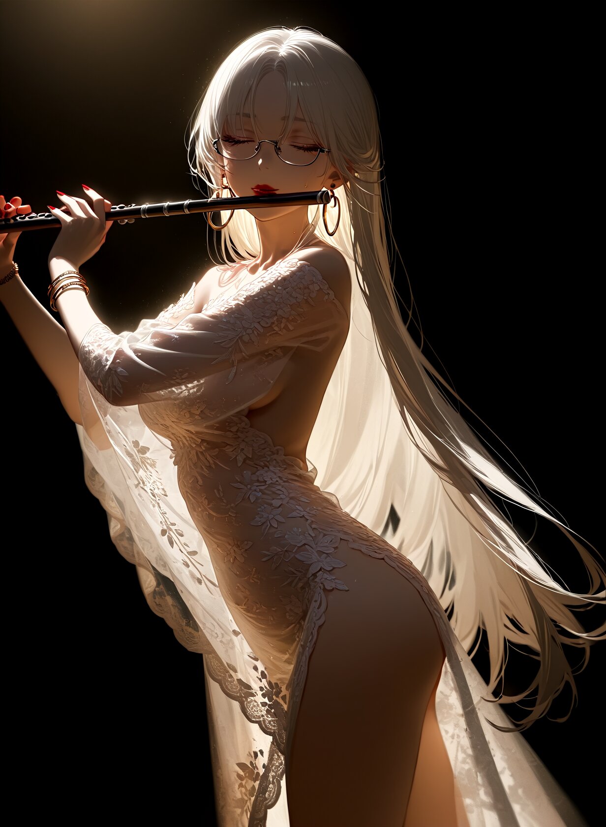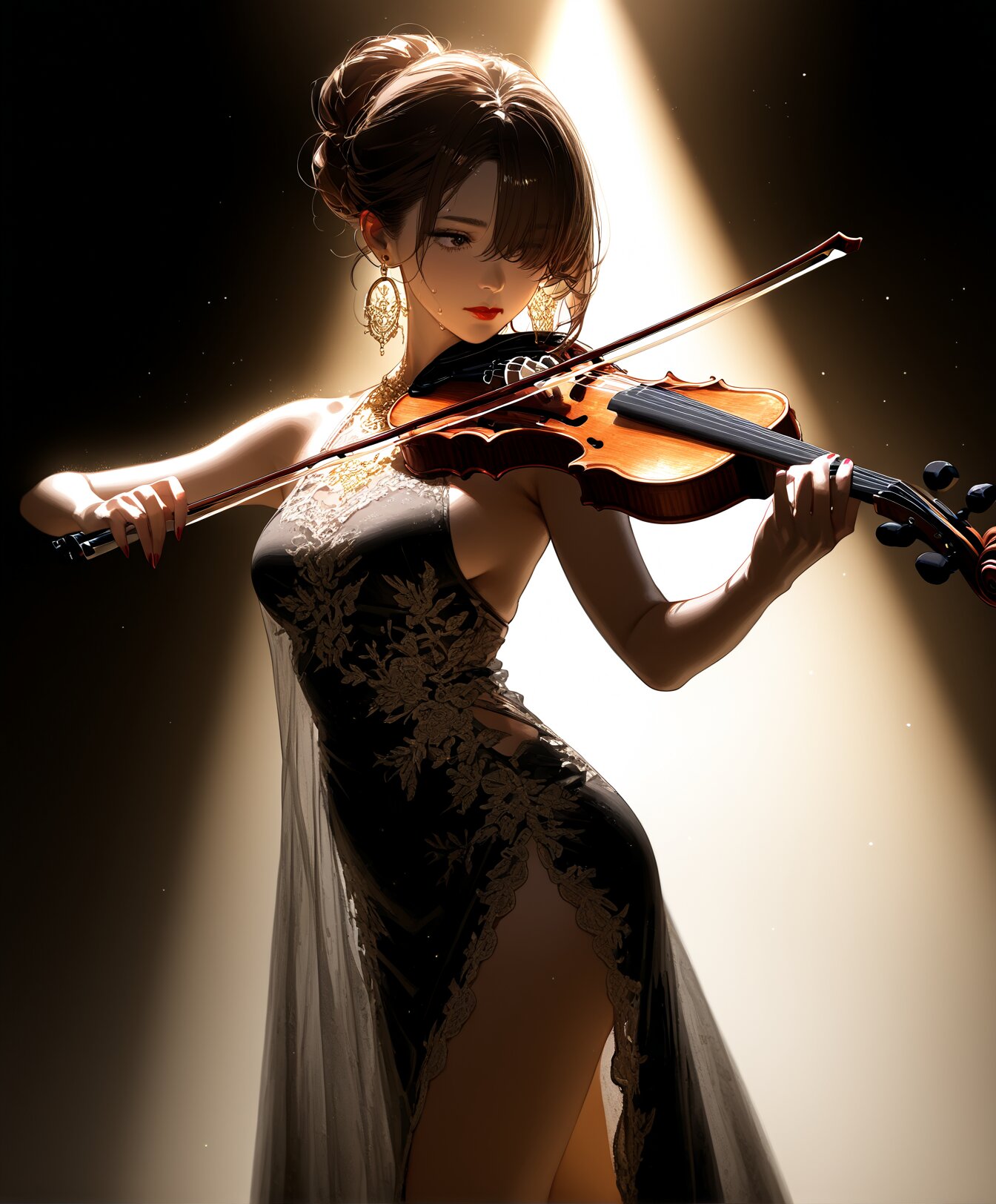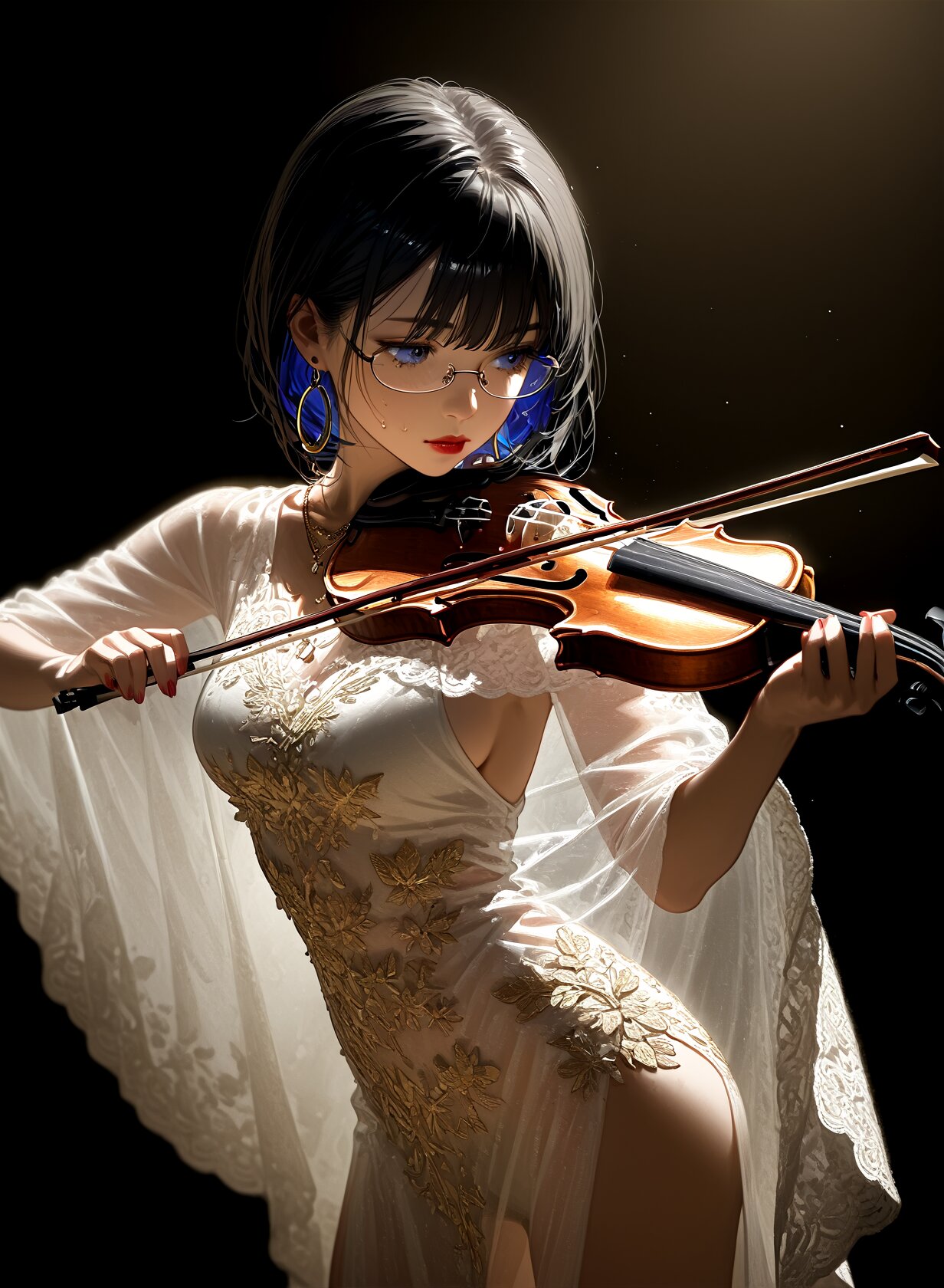 1girl, (extremely detailed CG unity 8k wallpaper:1.2100000000000002), (delicate facial features:1.2100000000000002), (ultra high res:1.2100000000000002), (extremely detailed eyes and face:1.2100000000000002), (perfect anatomy:1.2:1.2100000000000002), (super detailed skin:1.2100000000000002), (super fine illustration:1.2100000000000002), (clothes reflecting light:1.1), (caustics:1.1), (deep shadows:1.1), (faint light:1.1), side slit white long lace dress, halter neck dress, full open back dress, pin heels, from side, (sideboob:1.1), (close up:1.1), (see through clothes:1.1), (gold embroidery:1.1), mole, mole under eye, necklace, heavy makeup, standing stage, solist, shiny brown hair up, hair bun, sideburns, hair over one eye, bangle, anclet, sweat, slender, glossy red lips, head ornament, dress ornament, bokeh, head out of frame, backlighting, black background, simple background, hoop earrings. 1girl, jewelry, earrings, hoop earrings, realistic dark, Perfect hand, Detailed hand, lace clothing, lace dress, realistic, see-through, lips, breasts, see-through silhouette, ass, blurry playing instrument, holding violin, violin, holding bow, (music:1.1), playing instrument, playing-violin, bow, instrument, holding instrument, solo, holding, bangs, eyebrows visible through hair, dress holding violin <lora:Hoop_earrings:0.66> <lora:dark:0.66> <lora:Better hands - SDXL v2.0:0.8> <lora:lace_clothing:0.84> <lora:holding_violin_holding_bow_music:0.68> <lora:Playing Violin (pony) v1:0.69> <lora:holding_violin:0.71>
