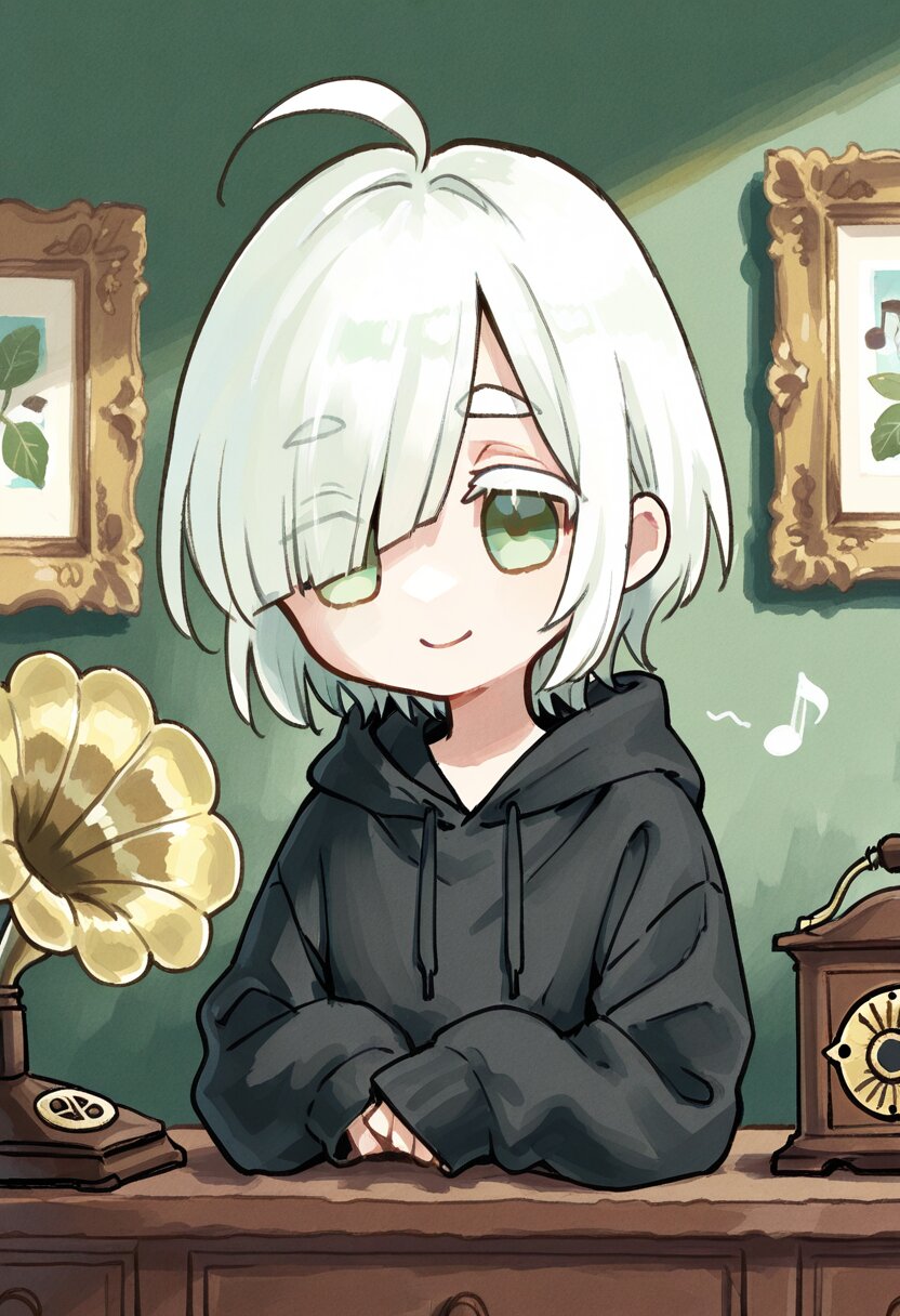 <lora:inmnstyleilxl:0.9>, best quality, masterpiece, very aesthetic, watercolor painting, general, 1girl, chibi, solo, (bright white hair), short hair, blunt bangs, white thick eyebrow, white colored eyelashes, (hair over one eye), ahoge, mint green eyes, oversize black hoodie, sleeves past wrists, smile, upper body, gramophone, antique room, musical note