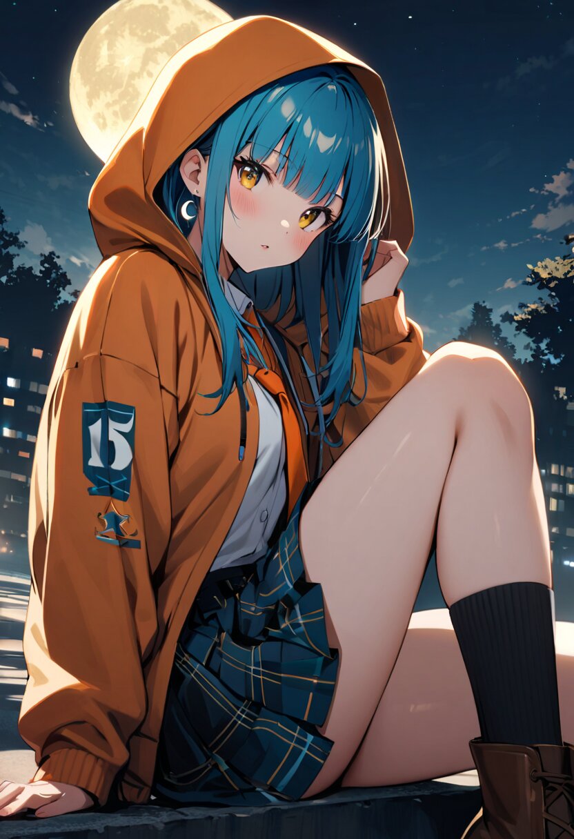 1girl, solo, 15years old, looking at viewer, blunt bangs, straight hair, long hair, low twintail Hang from the shoulders in front, yellow eyes, turquoise blue hair, earrings, long sleeves, white collared shirt, orange hoodie, hood up, orange necktie, black plaid skirt, pleated skirt, open hoodie, knee socks, boots, black socks, (bare legs, thighs), parted lips, blush, Sitting with Knee Up, parted lips, outdoors, at night, sky, crescent moon, from side, face focus,