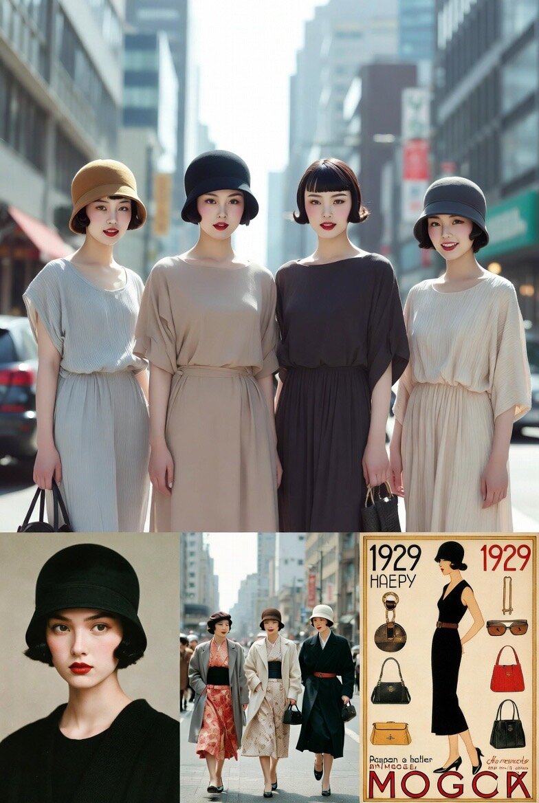 An anime-style illustration of young Japanese women inspired by 1930s moga, in a city setting with Western-Japanese elements.