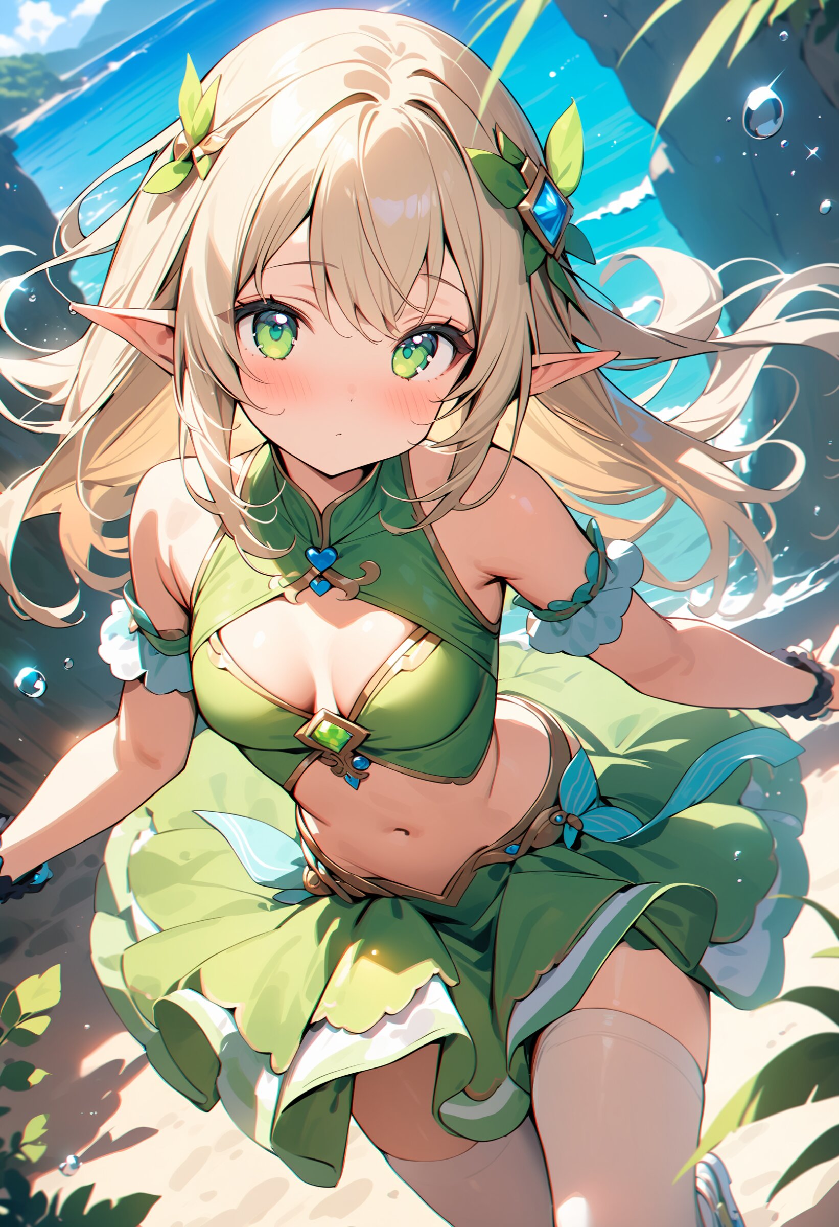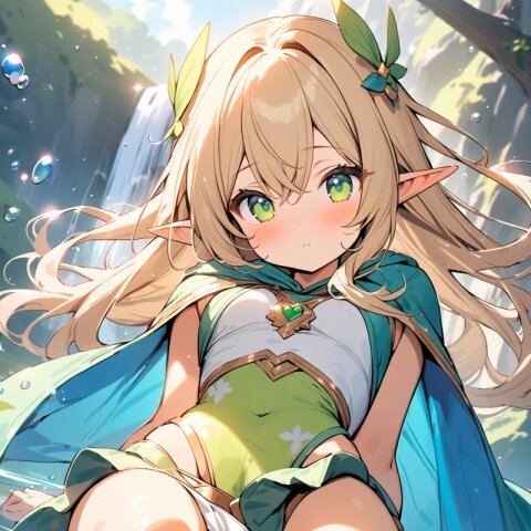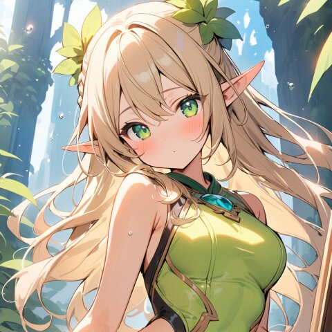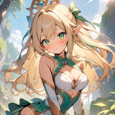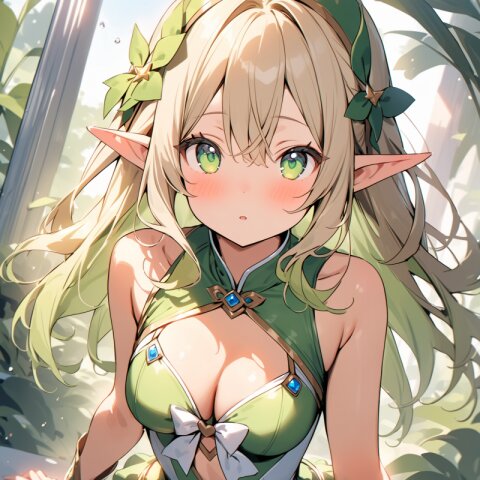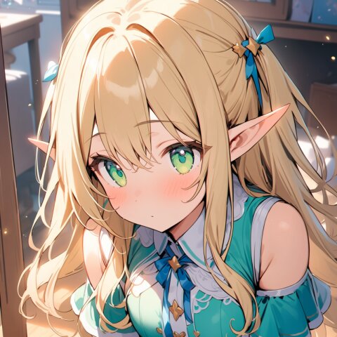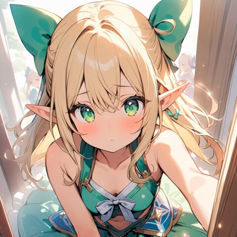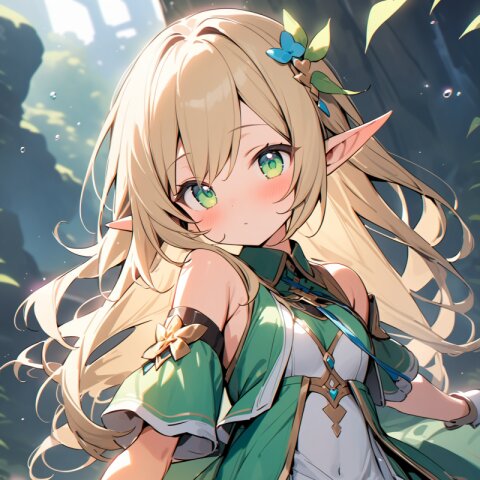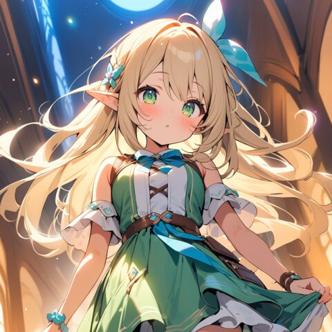 ((masterpiece)), ((best quality)), ((kawaii)), cute, (lovely), ((extremely detailed)), (beautiful), dynamic angle, a cute girl, 1girl, solo, ((elf )),beautiful blond hair, beautiful green eyes, ((beautiful eyes)), long hair, fantasy clothes,
