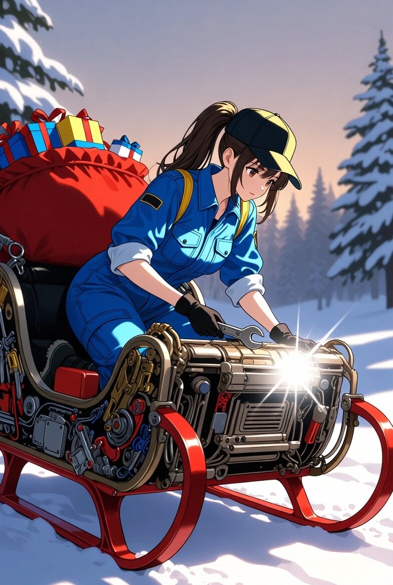 A young Japanese woman mechanic works on a sleigh in a snowy landscape, in a detailed digital illustration style.