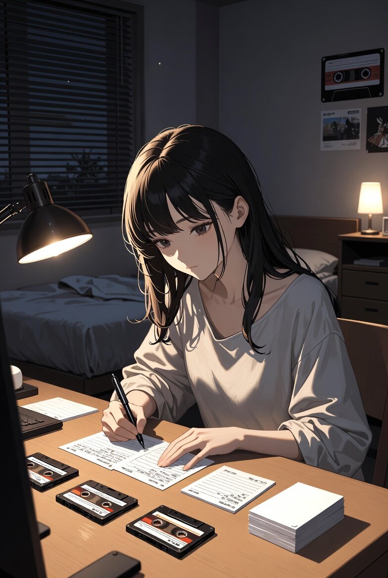 A young Japanese woman creates a mixtape in her dimly lit bedroom at night.