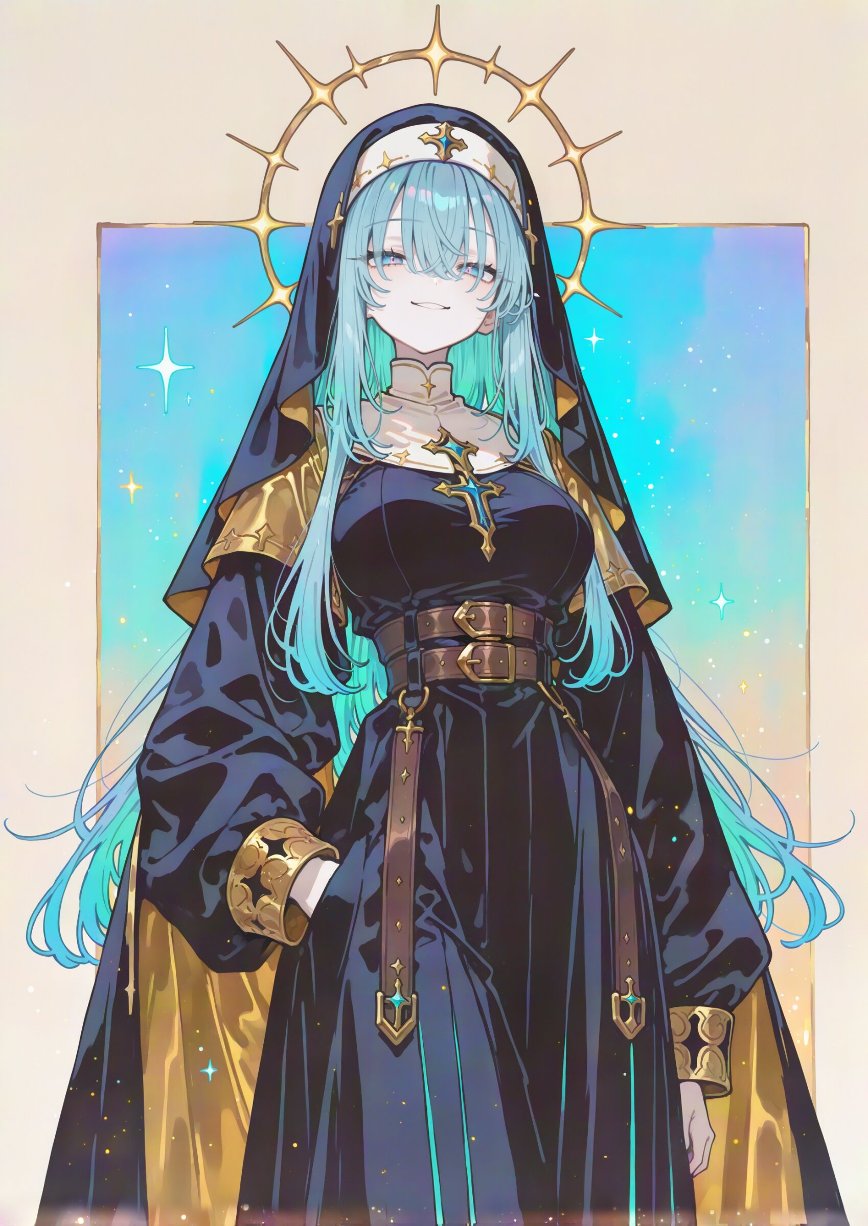 from front (close up:1.3), knees out of frame High Horizon , looking at viewer, (simple pastel color background:1.1), drop shadow, colored shadow, 1girl, nun, beautiful detailed eyes, holy face, cool Elegant and sophisticated demeanor, (pale skin:1.0), skindentation, beautiful sepia eyes, , multicolored hair, garnet,lime green,pale blue hair, extra long hair, pointy hair hair over eyes , floating hair, first-rate female bodies perfect body beautiful large breasts medium hips, narrow waist, solo, nun, Good texture Mystical Veil, gold plain cape, , black majestic Coat, long sleeves, the feel of fluffy, , belt buckle, chest belt, , , , long skirt, frilled skirt, vertical-striped high-waist pantyhose, , shiny smile, (seductive smile:1.0), hand in pocket super fine concept art, hard surface, 8K, masterpiece, best quality, amazing quality, very aesthetic, absurdres, professional art lots of details, , overexposure, shiny-glistening, (watercolor style:1.0), (pastel color style:0.5) 4ur4_illu,shiny, glowing, glowing particles, glowing light particles, light particles, <lora:noline (1):1.0> <lora:sdxl2-flat2-512b:0.15> <lora:facelightup_xl_v10:0.5> <lora:V2_yakumo_alchemy:0.5> <lora:Aura_illu:0.1>